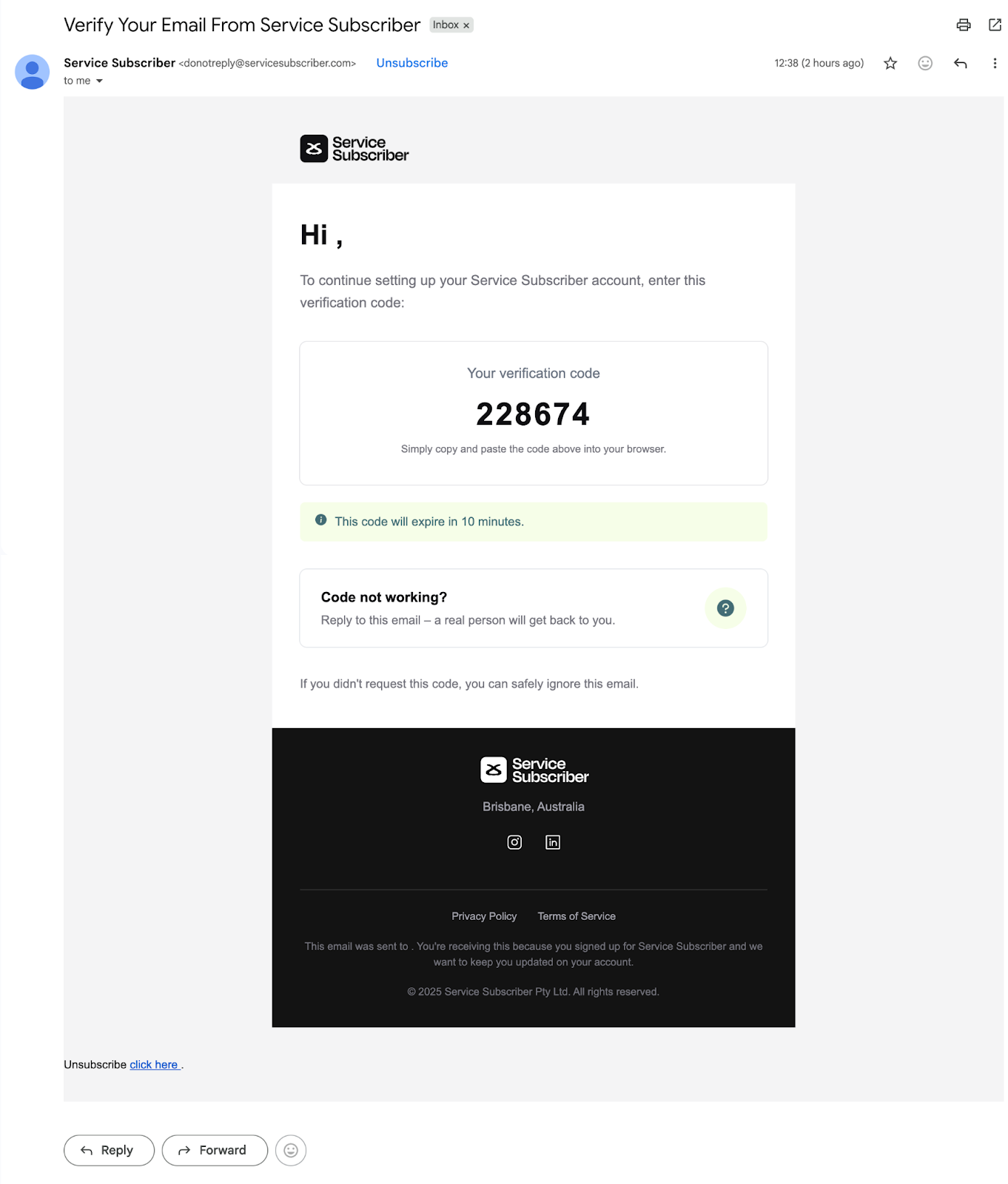 The subject line will say something like "Your Service Subscriber Verification Code"