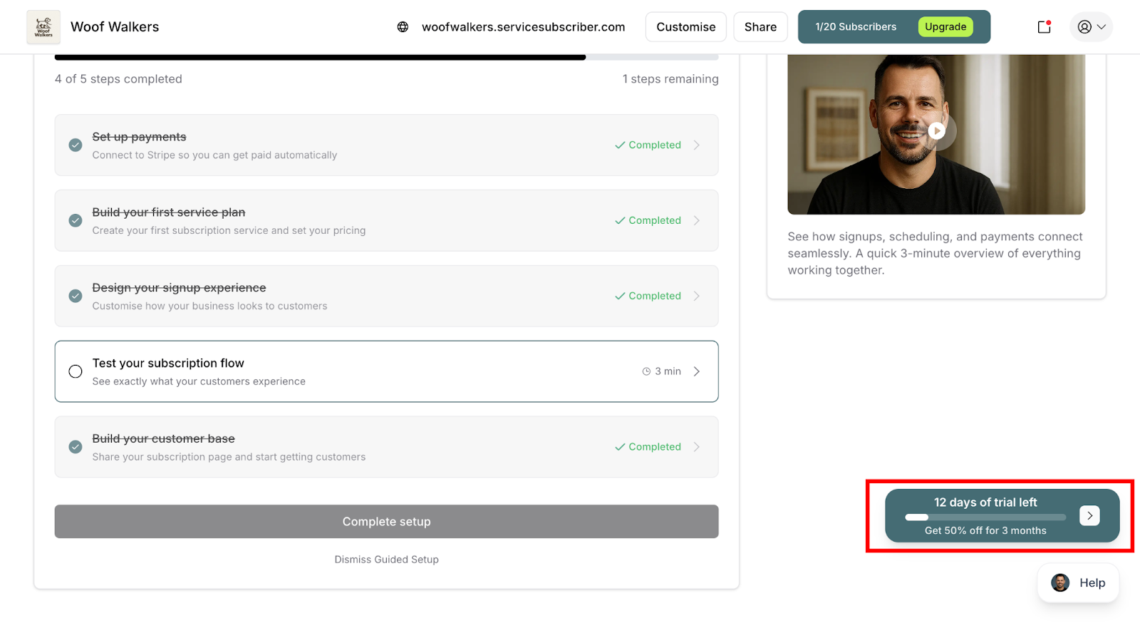 ✍️ TIP: Your trial isn't just for testing—it's for building. Many business owners get their first paying customers during their trial period (whether subscribers or one-off purchasers) and start generating real revenue before they ever pay ServiceSubscriber a penny.