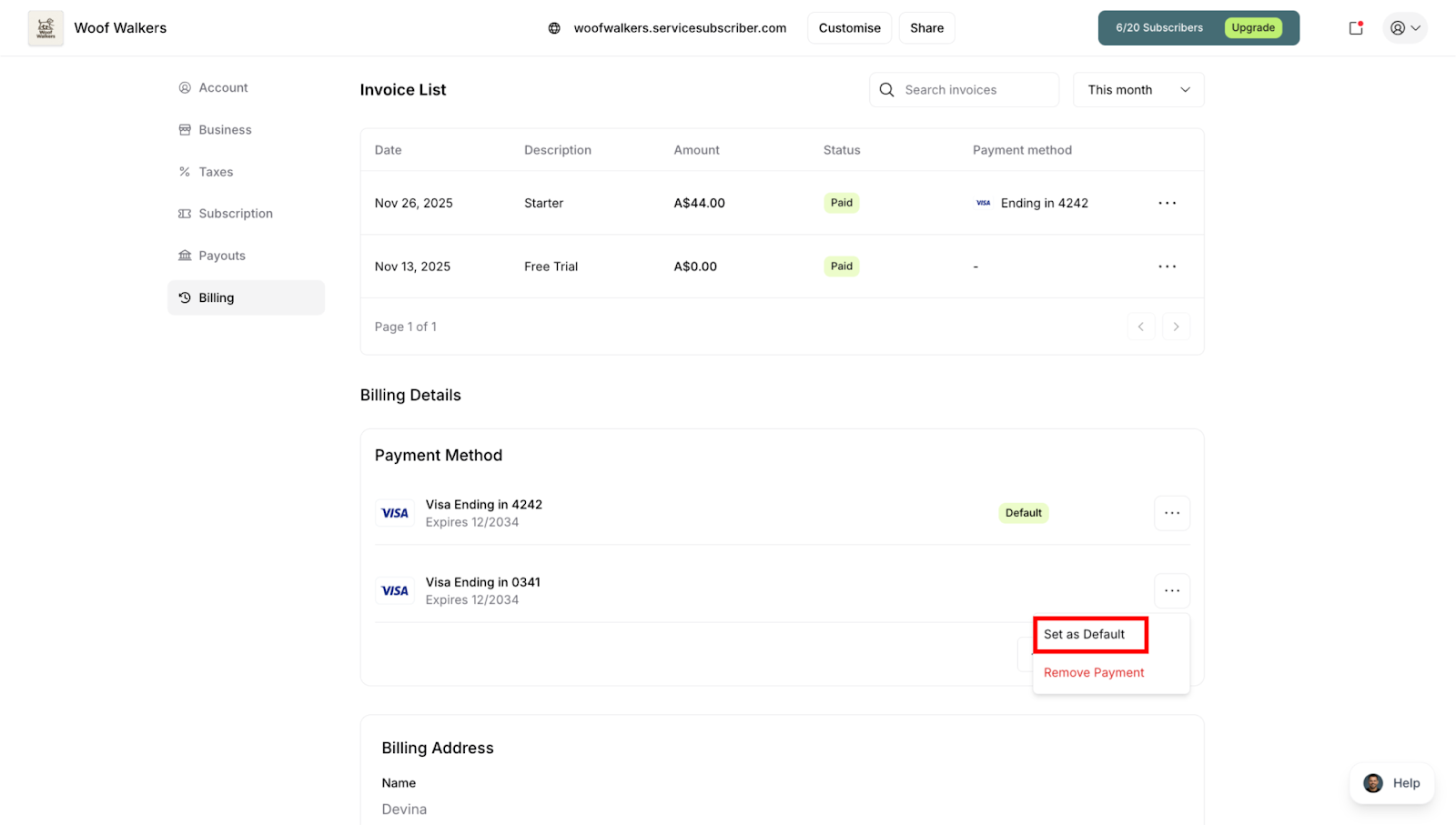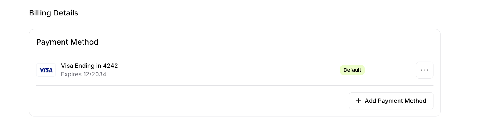 ✍️ TIP: You can keep multiple payment methods on file and switch between them as needed. Just make sure the card you want to use for billing is set as the default.