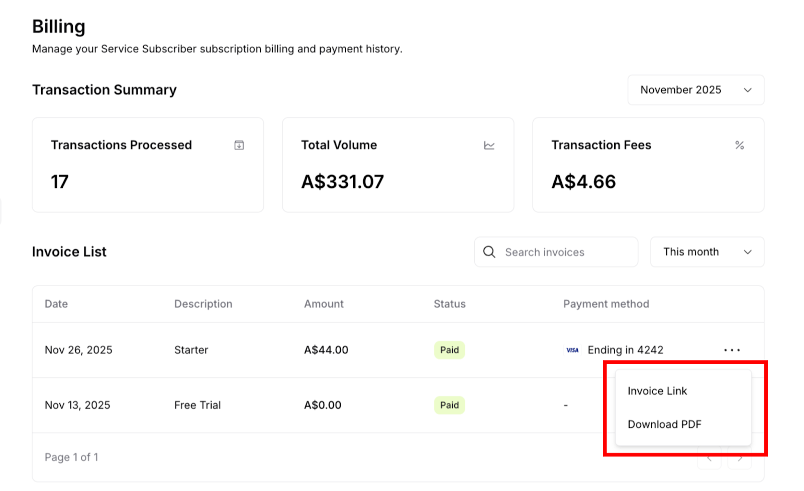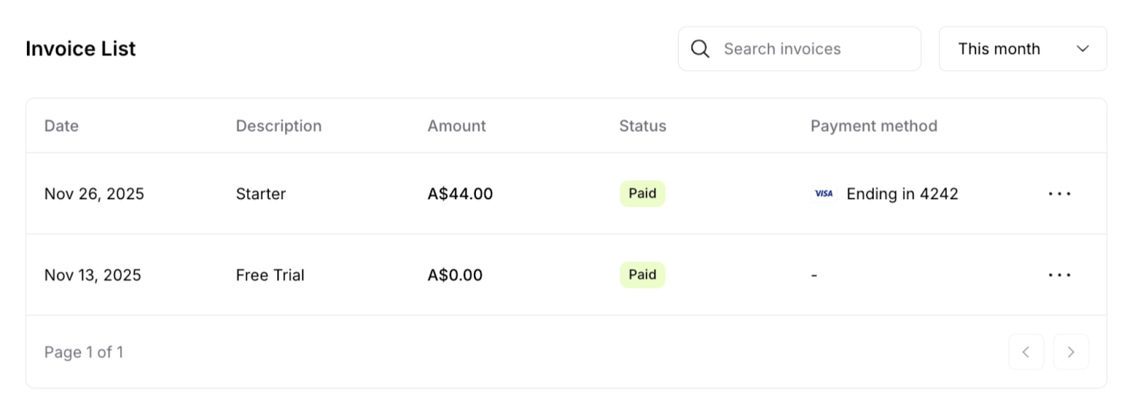 Your billing history provides easy access to all your platform invoices for accounting and tax purposes.