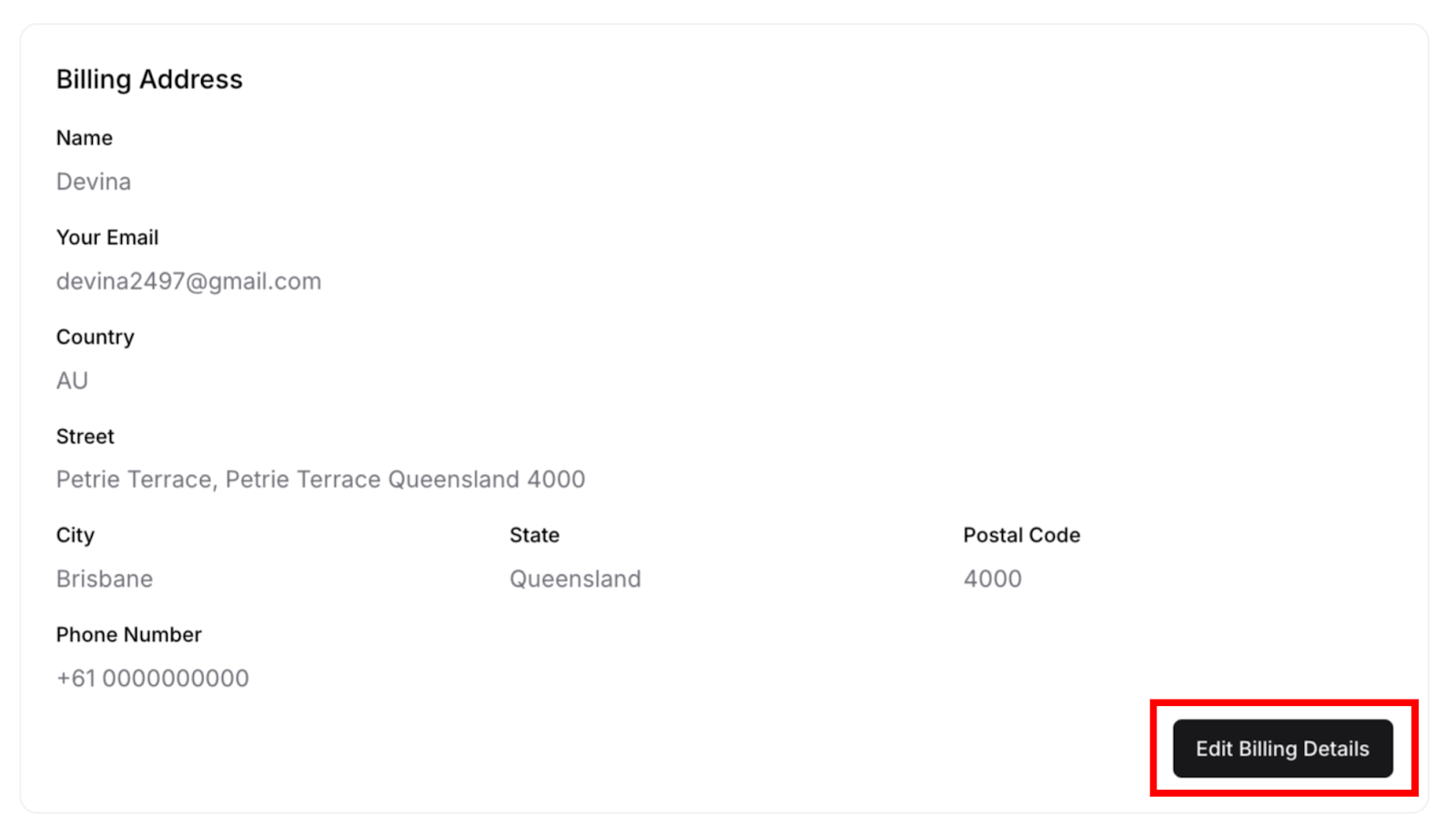✍️ TIP: Ensure your billing address matches your payment method's registered address to avoid payment processing issues and ensure accurate tax calculations.