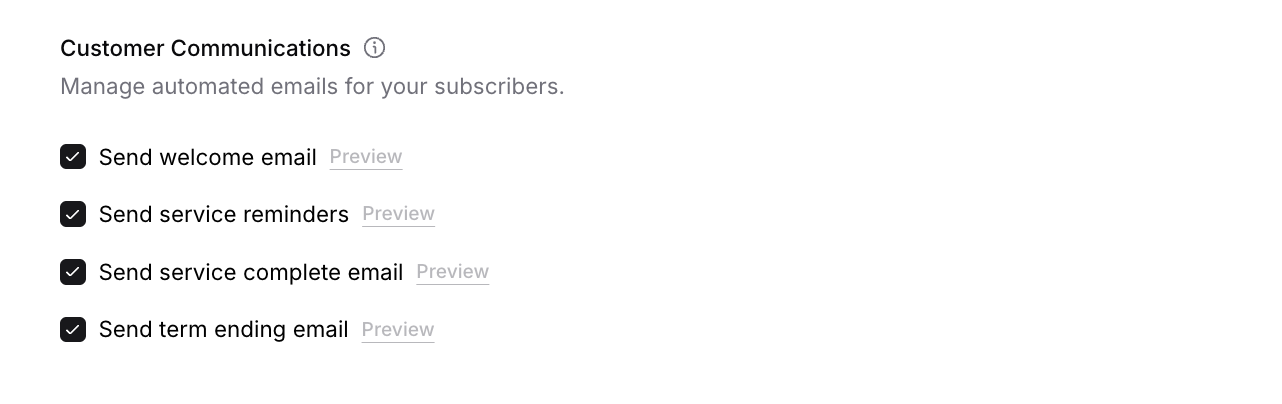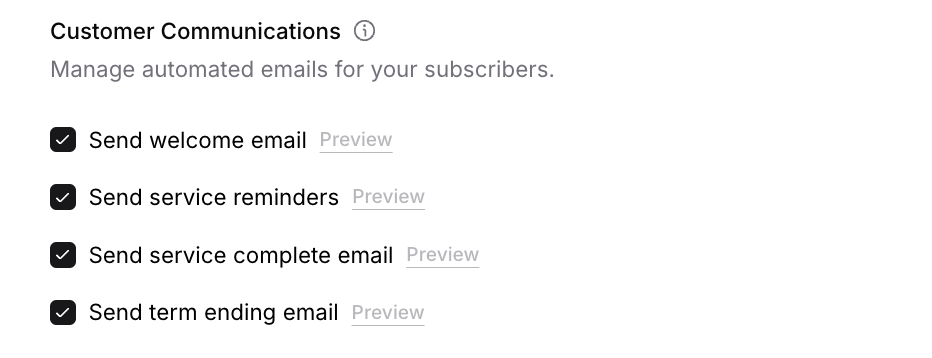 Customer communication settings control which automated emails your subscribers receive throughout their subscription journey.