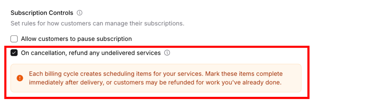 ✍️ TIP: More customer flexibility generally increases satisfaction and retention for subscription customers, but consider your business requirements and operational capacity before enabling self-service options.