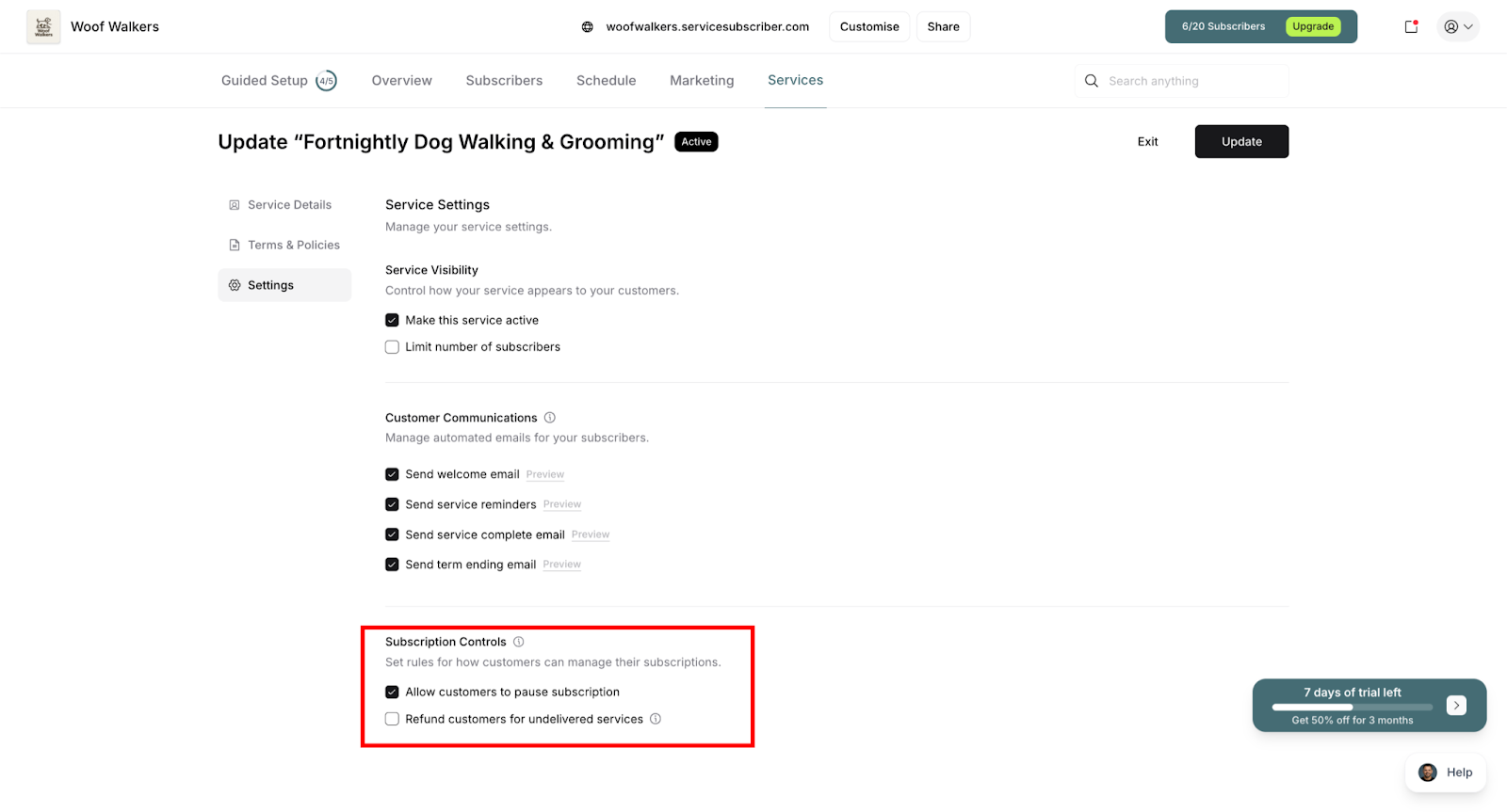 Update Subscription Controls settings