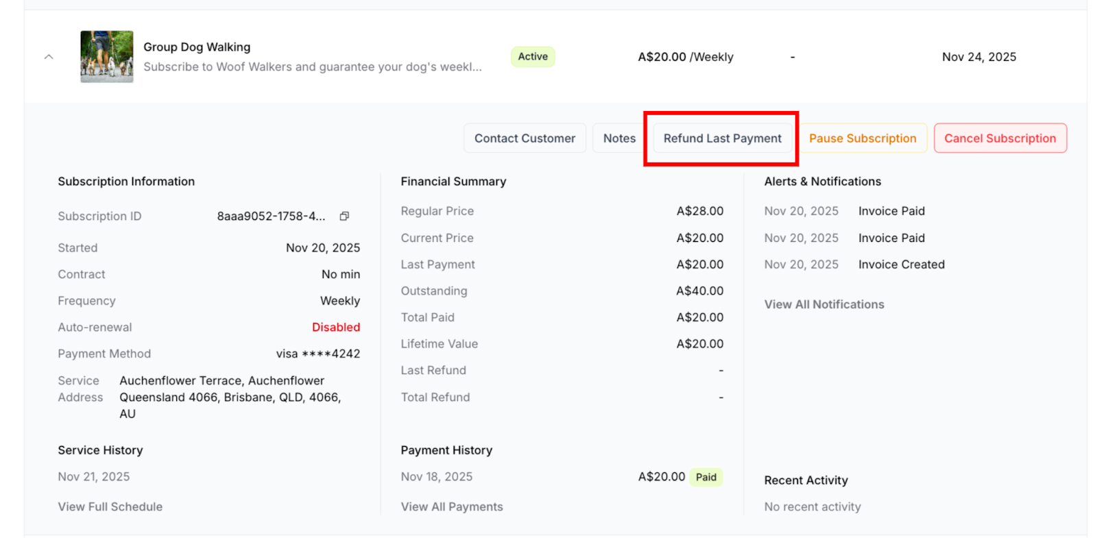 Why these are subscription-only: One-off purchases are single transactions with one delivery. They cannot be paused (already one-time) and customers cannot self-cancel them. If you need to cancel a one-off purchase, you must do so manually through the dashboard and issue a refund.
