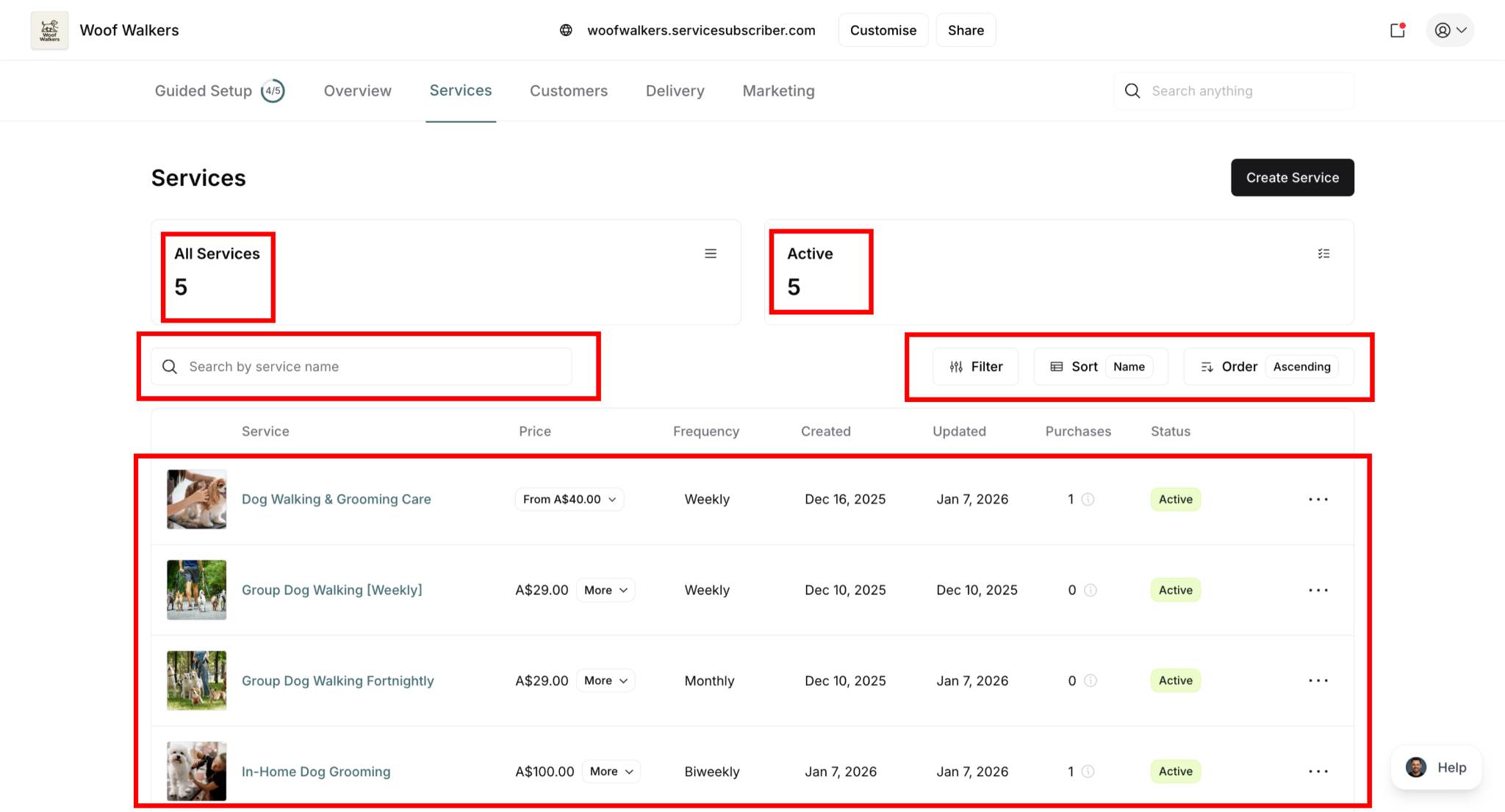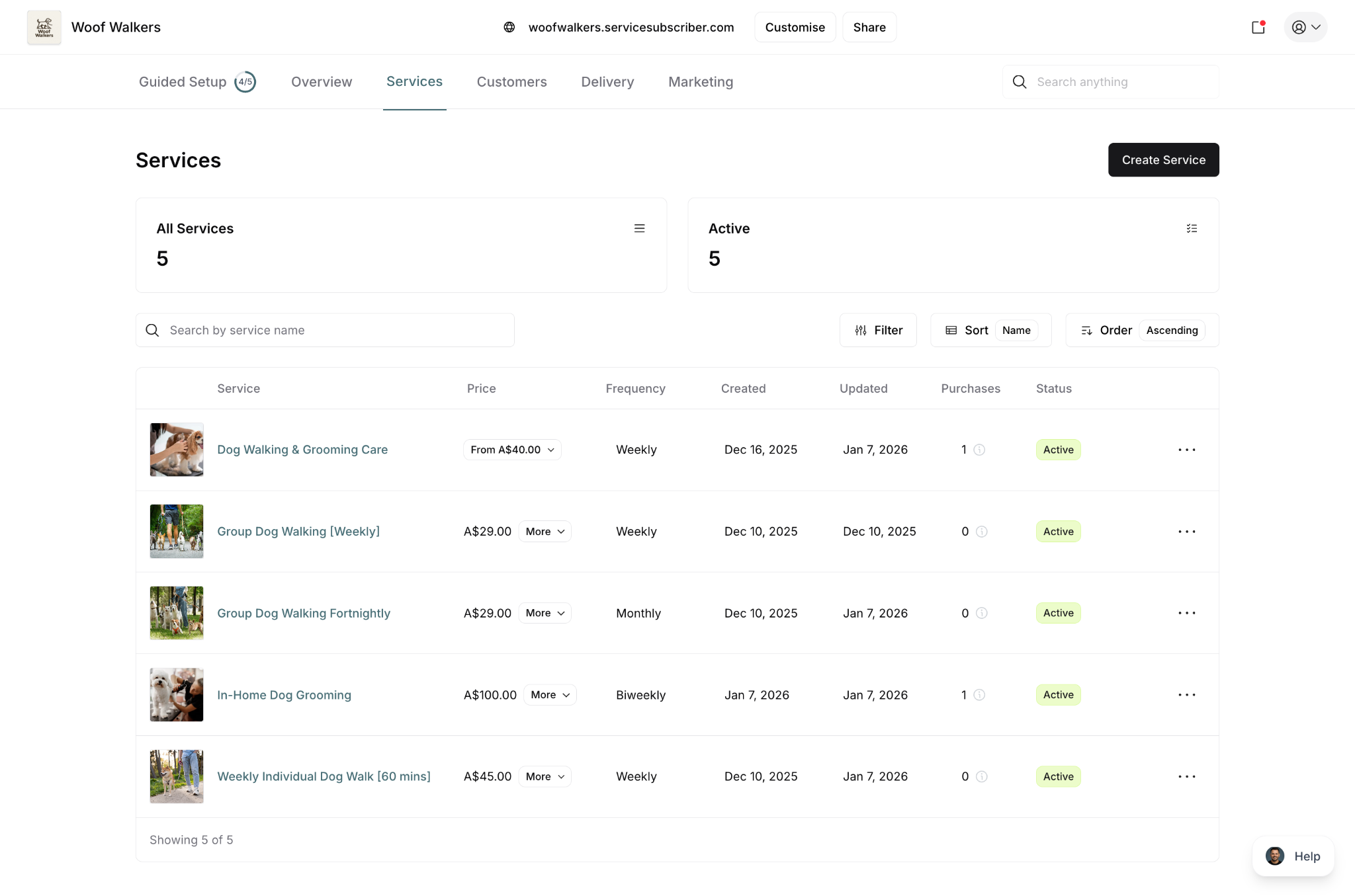 ✍️ TIP: The Services page is your command center for all service management. Use it to monitor performance, track customer counts, and quickly access any service for editing.