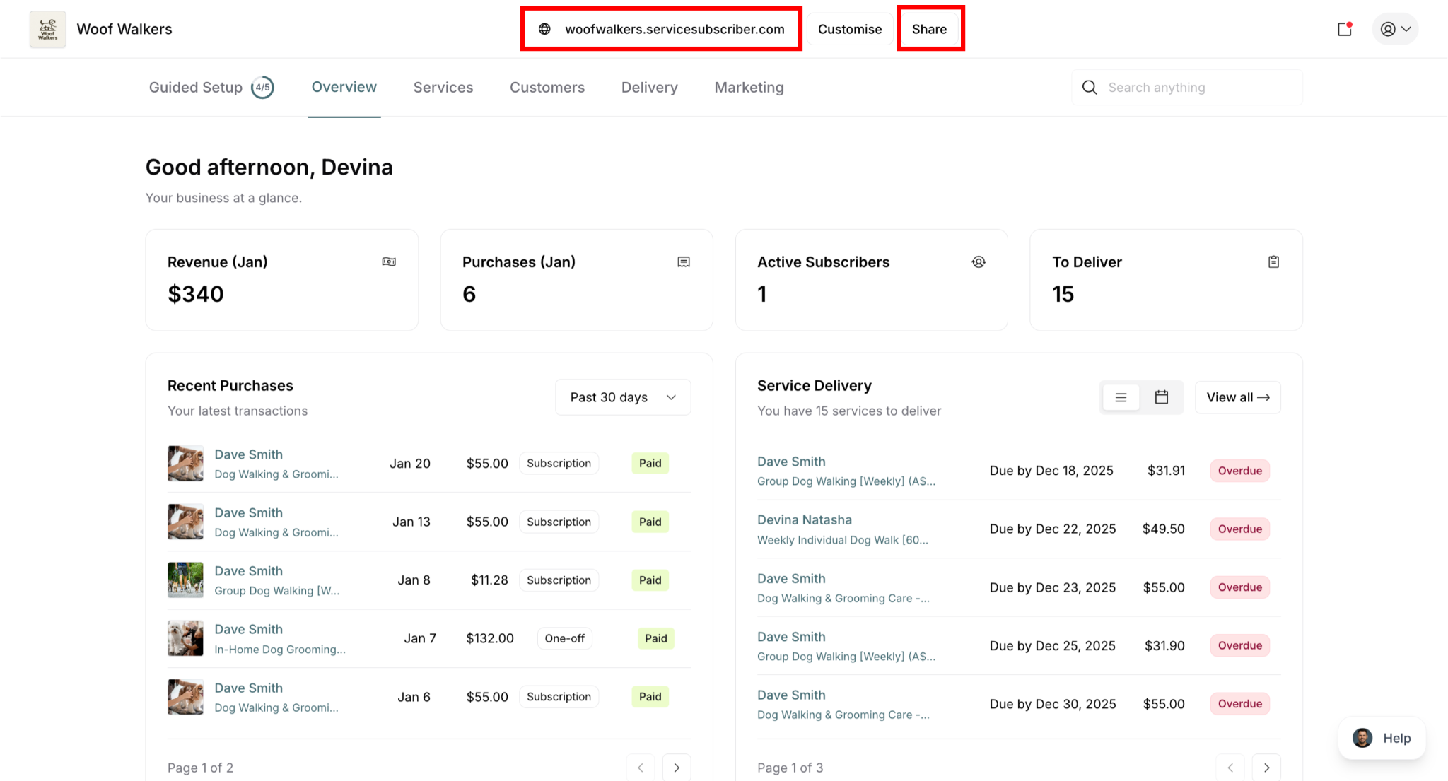 ✍️ TIP: Your URL is always: yourname.servicesubscriber.com where "yourname" is the subdomain you chose during setup.