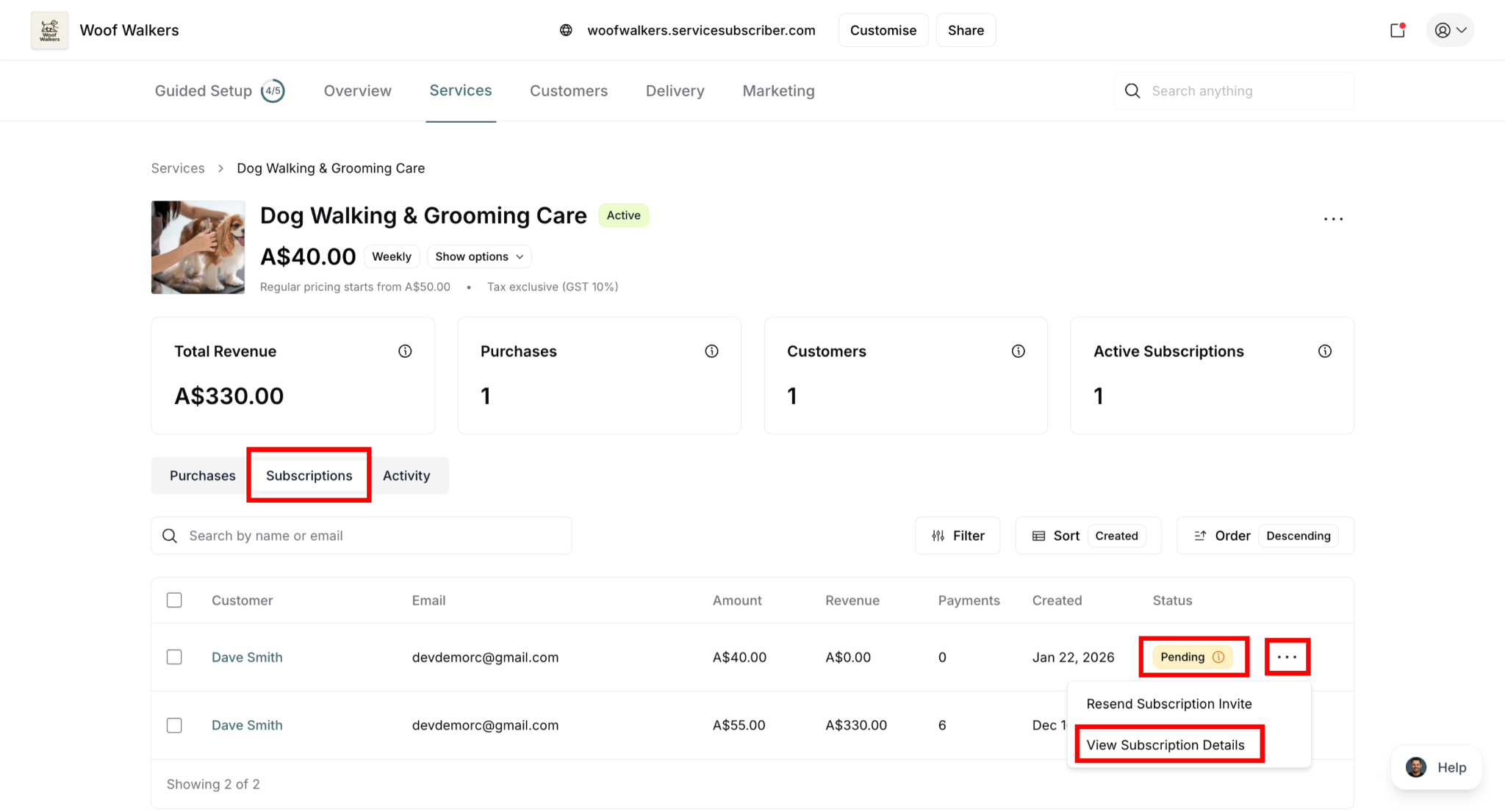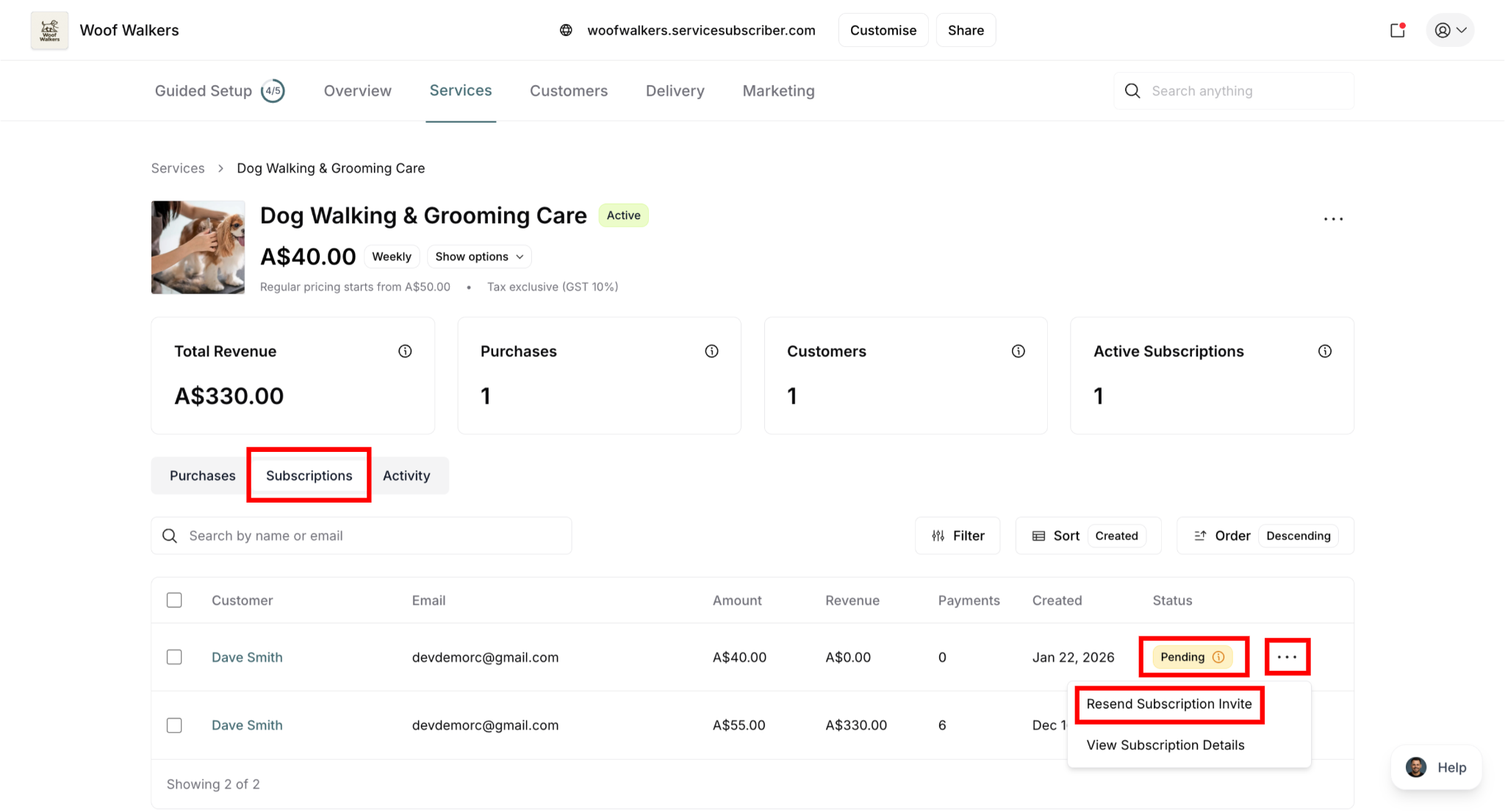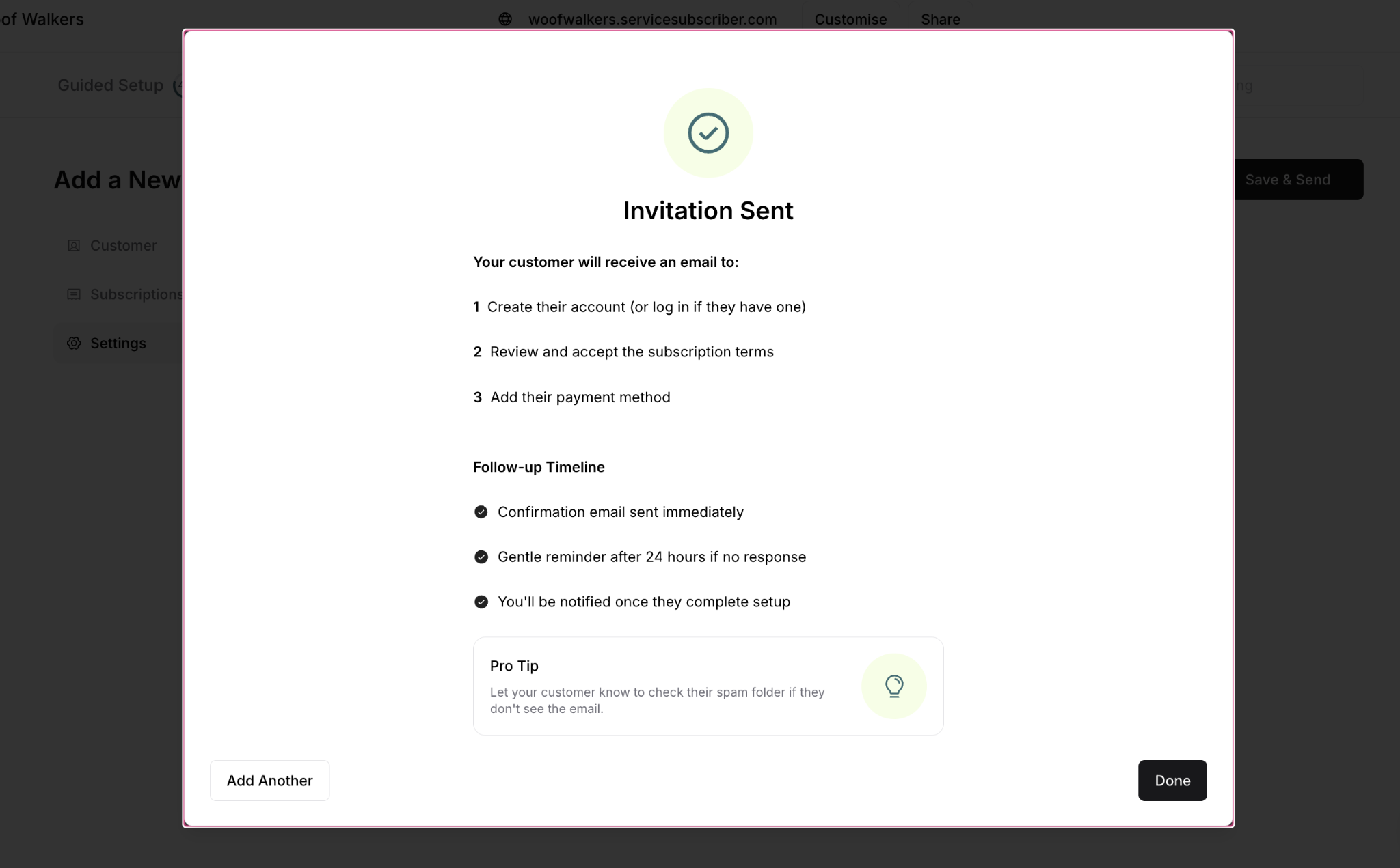 What happens immediately: Subscription is created with "Pending" status, invitation email is sent to customer automatically, and the subscription appears in your Subscribers list for tracking.