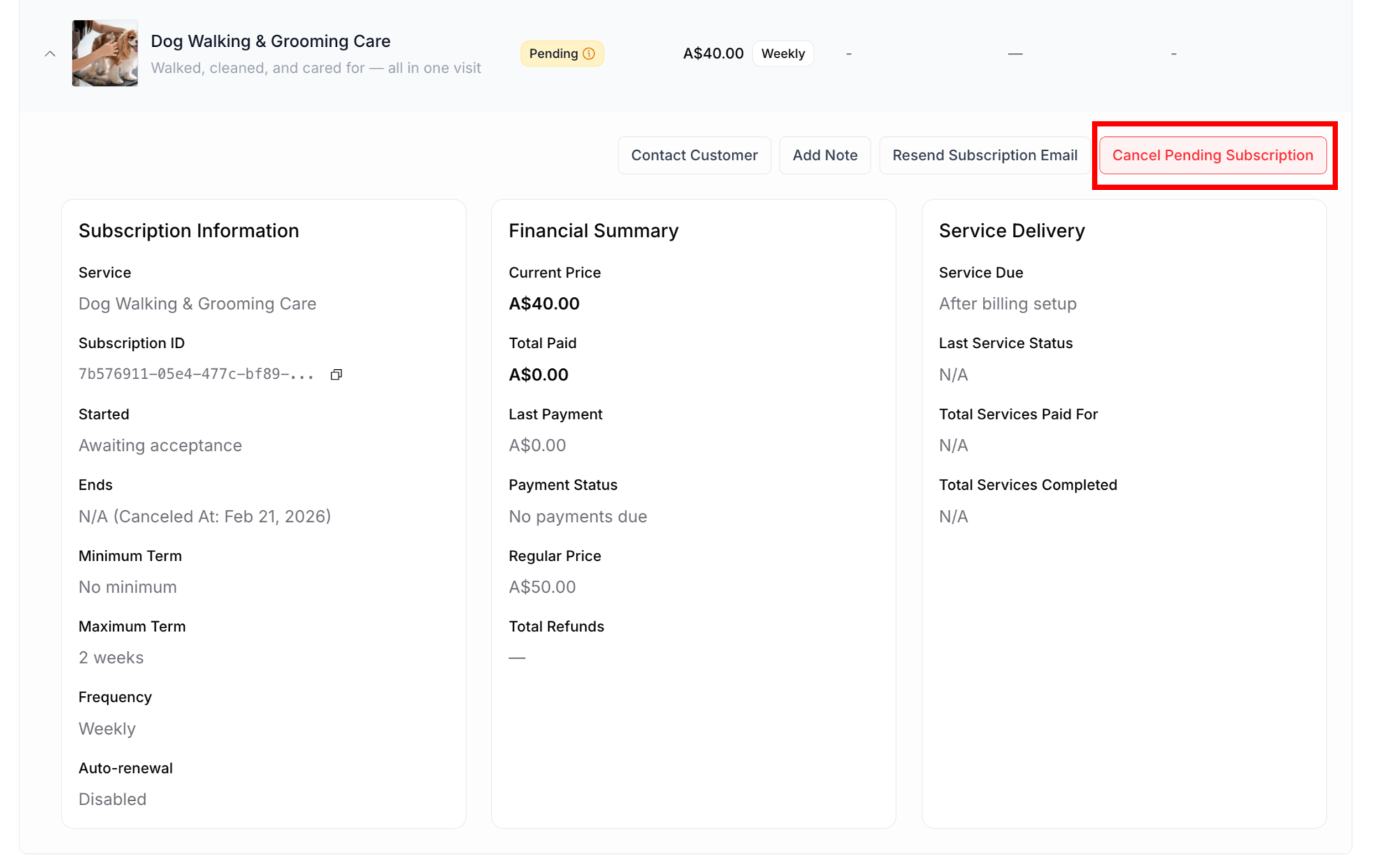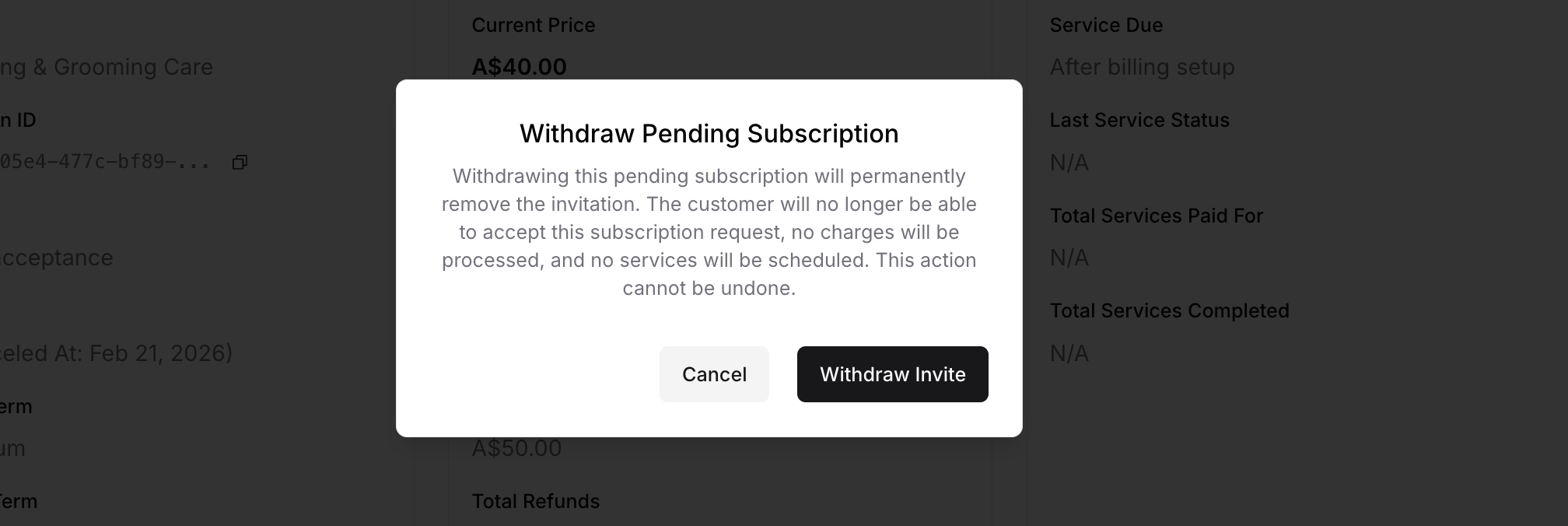 ⚠️ IMPORTANT: You can only cancel invitations with "Pending" status. Once a customer accepts and the subscription becomes "Active," you cannot cancel it this way—you must use the regular cancellation process.