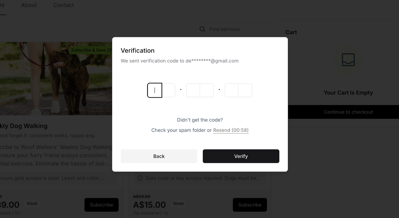 What happens next: Customers are prompted to enter email for OTP verification, selected subscription is added to cart, and they're ready to proceed to checkout and complete signup.