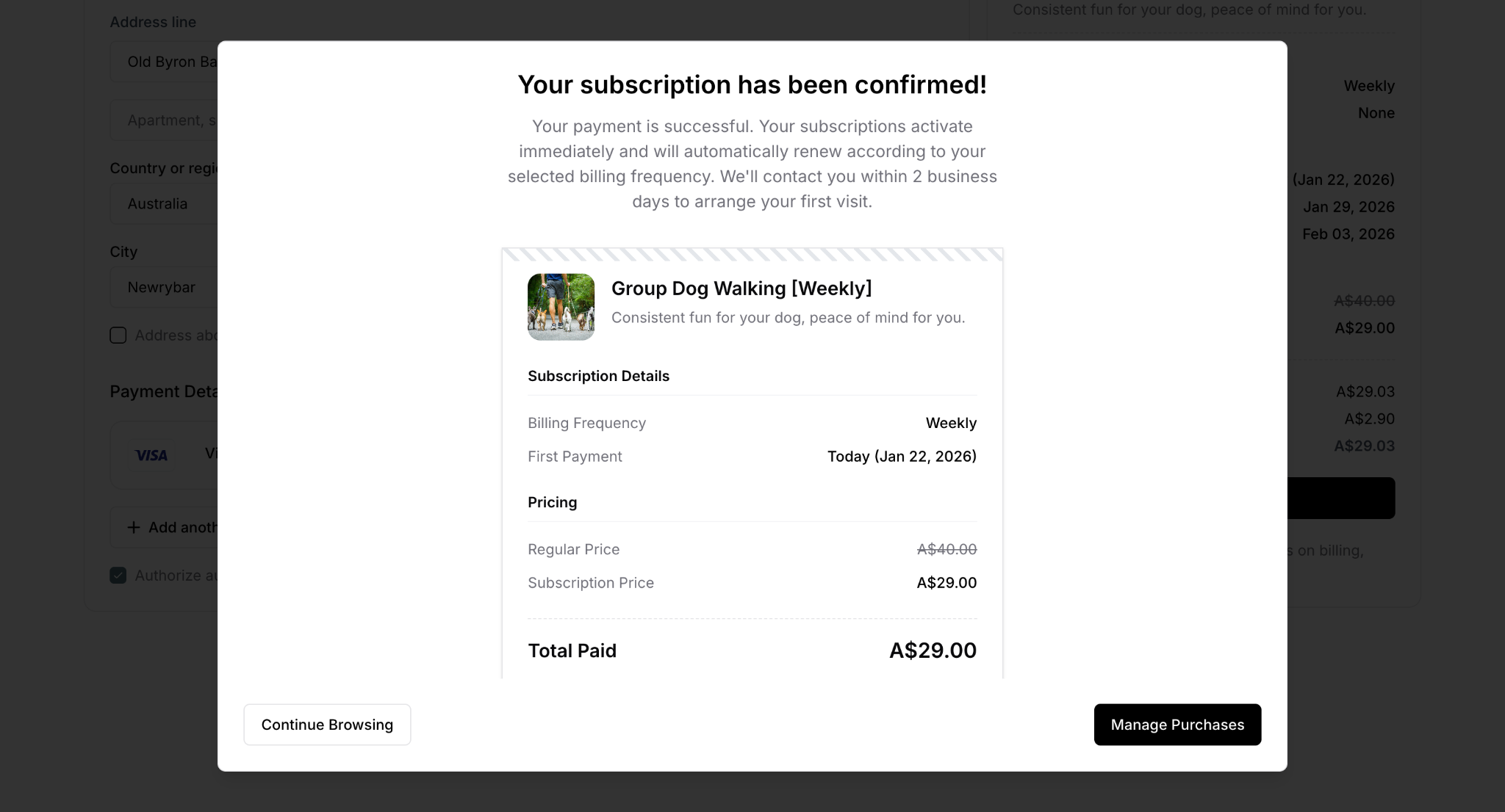 Next payment scheduled based on subscription frequency (7 days for weekly, 14 for fortnightly, etc.)