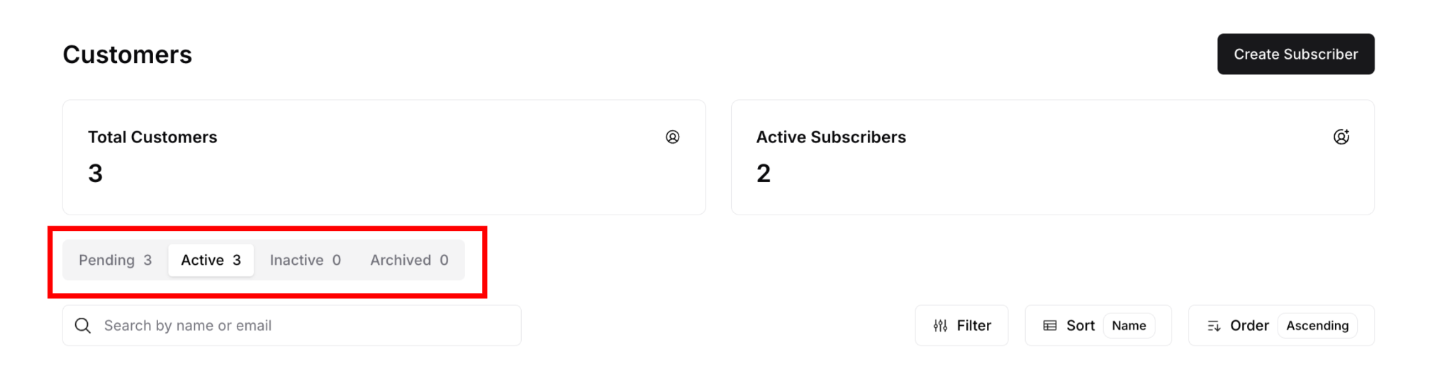 For example: If Jane has one active subscription and one pending invitation, she appears in both Active and Pending tabs