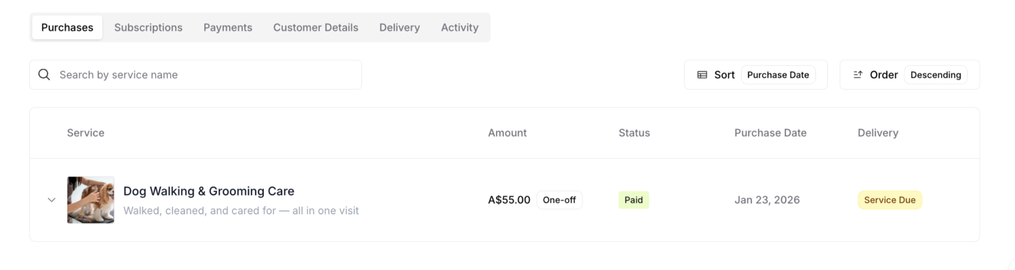 Your Customers dashboard is mission control for managing all customer relationships. It shows who has purchased from you (subscriptions or one-off purchases), their purchase details, payment history, and scheduled services—everything you need to deliver great service.