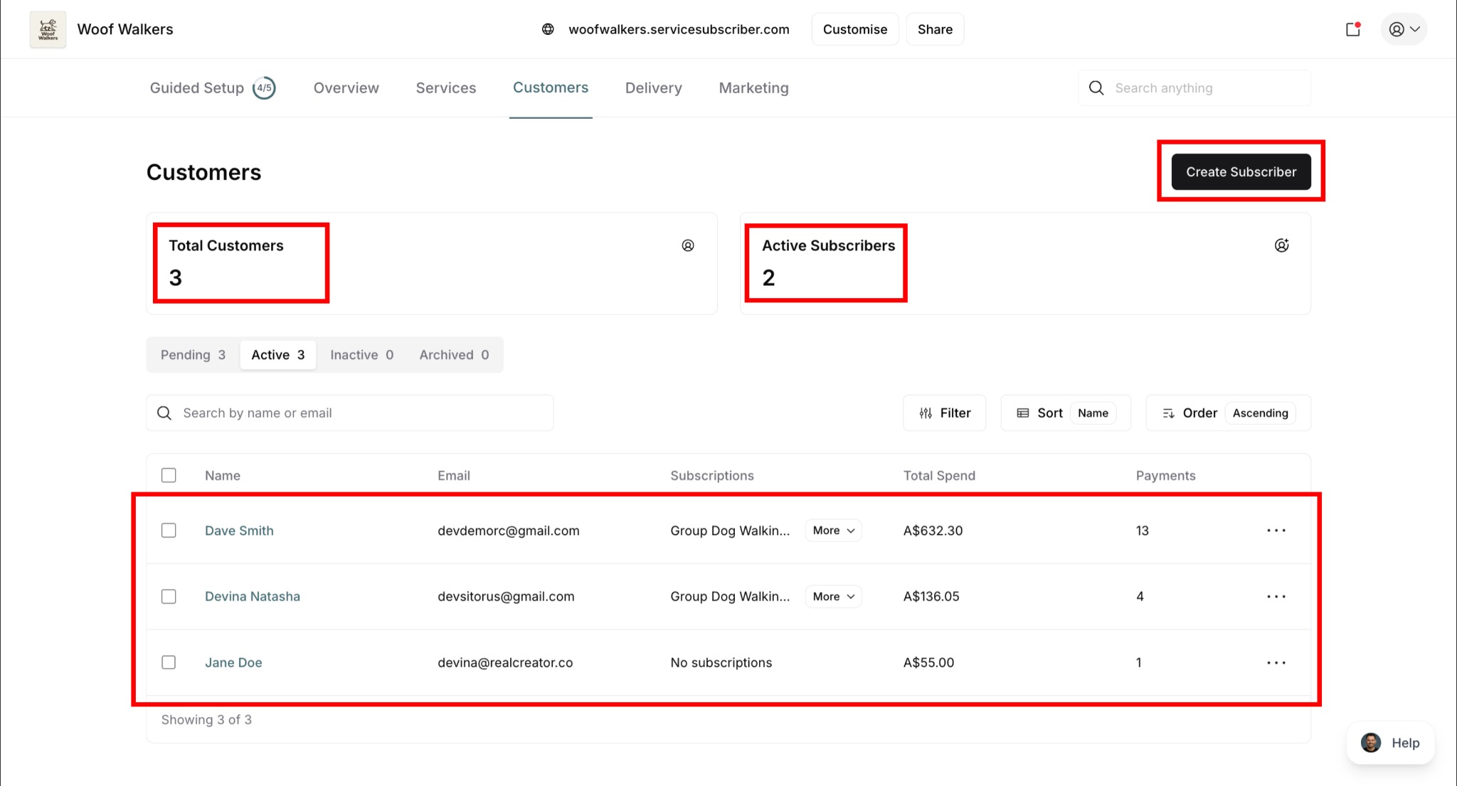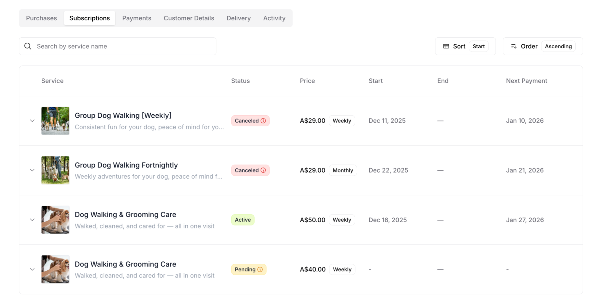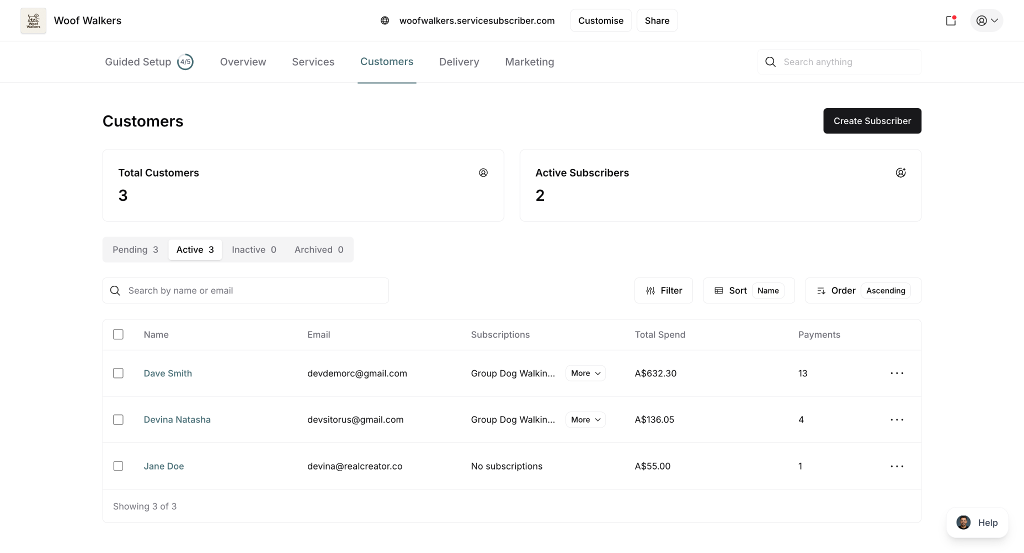 Active subscribers: Shows service name with "More" dropdown if multiple subscriptions (e.g., "Group Dog Walkin... More")
