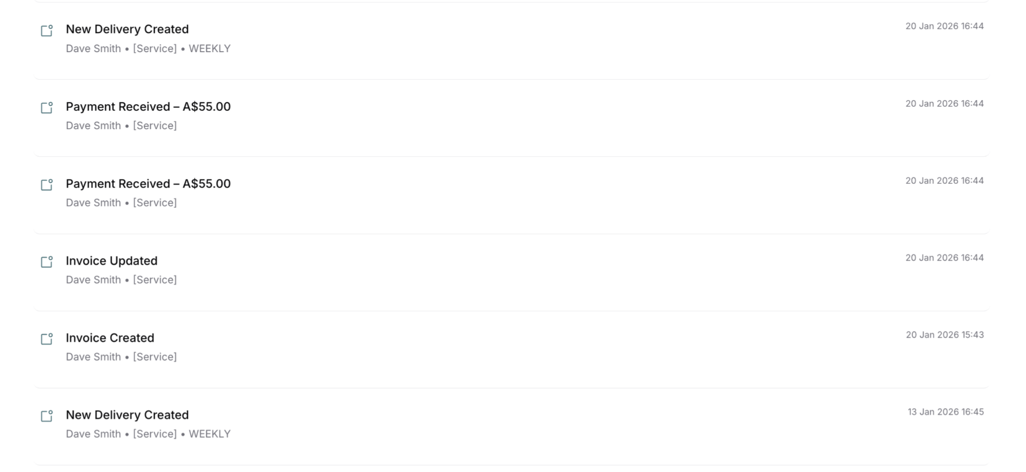 Delivery status (Service Due, Overdue, Completed)
