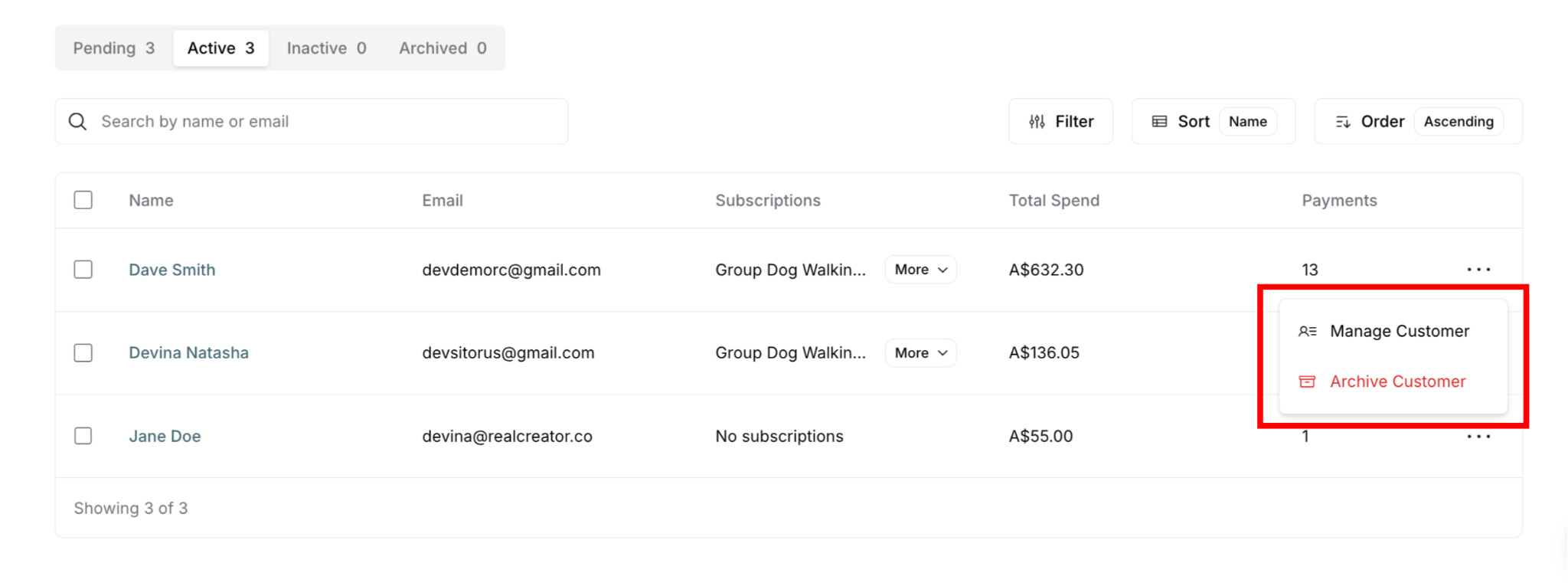 Customers are organized into four status tabs based on their subscription status. The tab system allows you to quickly filter and view customers by their current state.