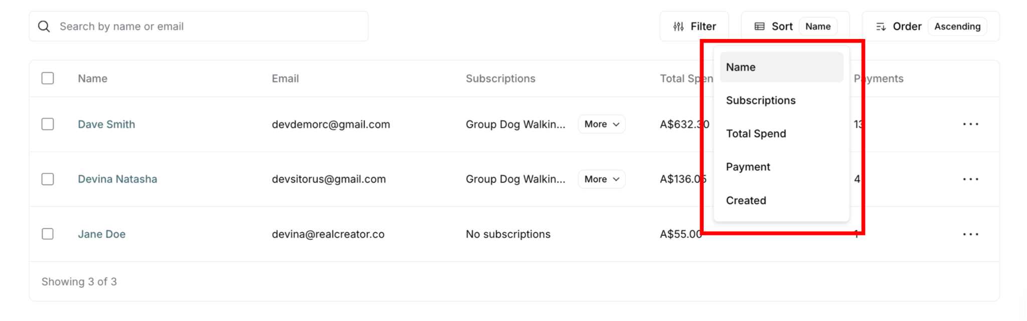 Use the search bar at the top: "Search by name or email"