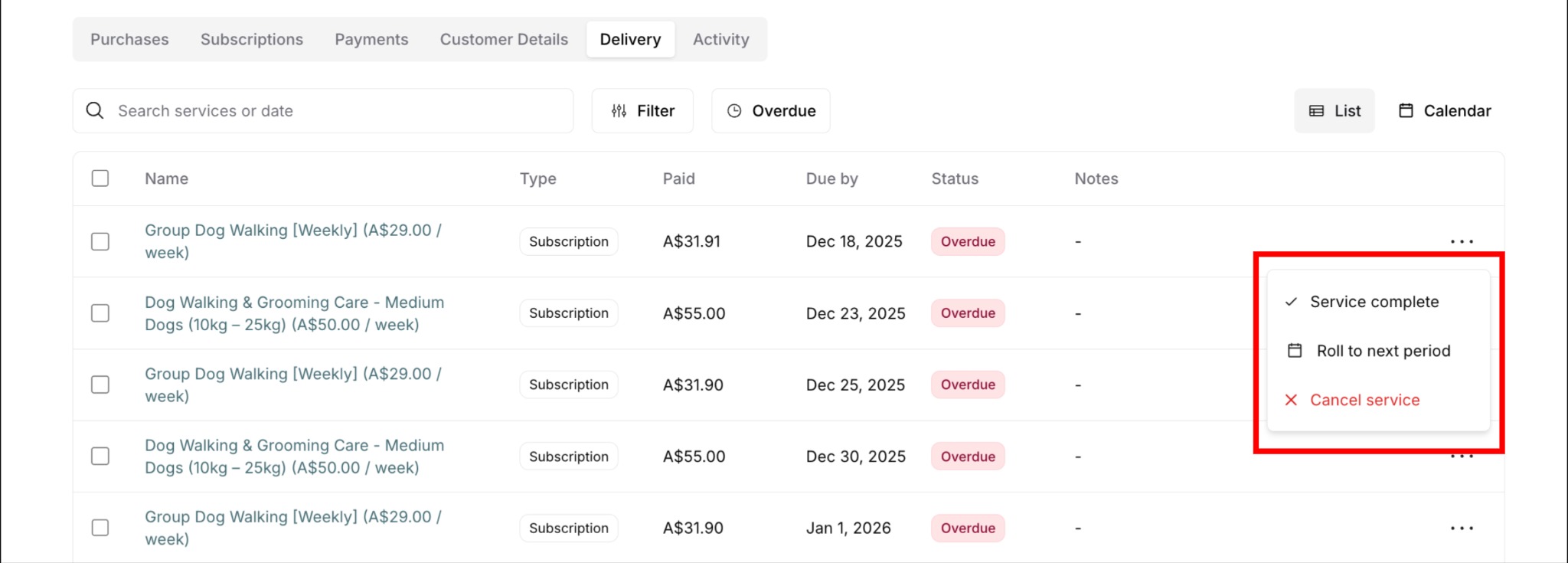 Action menu (⋯): Mark complete, roll to next period, cancel service