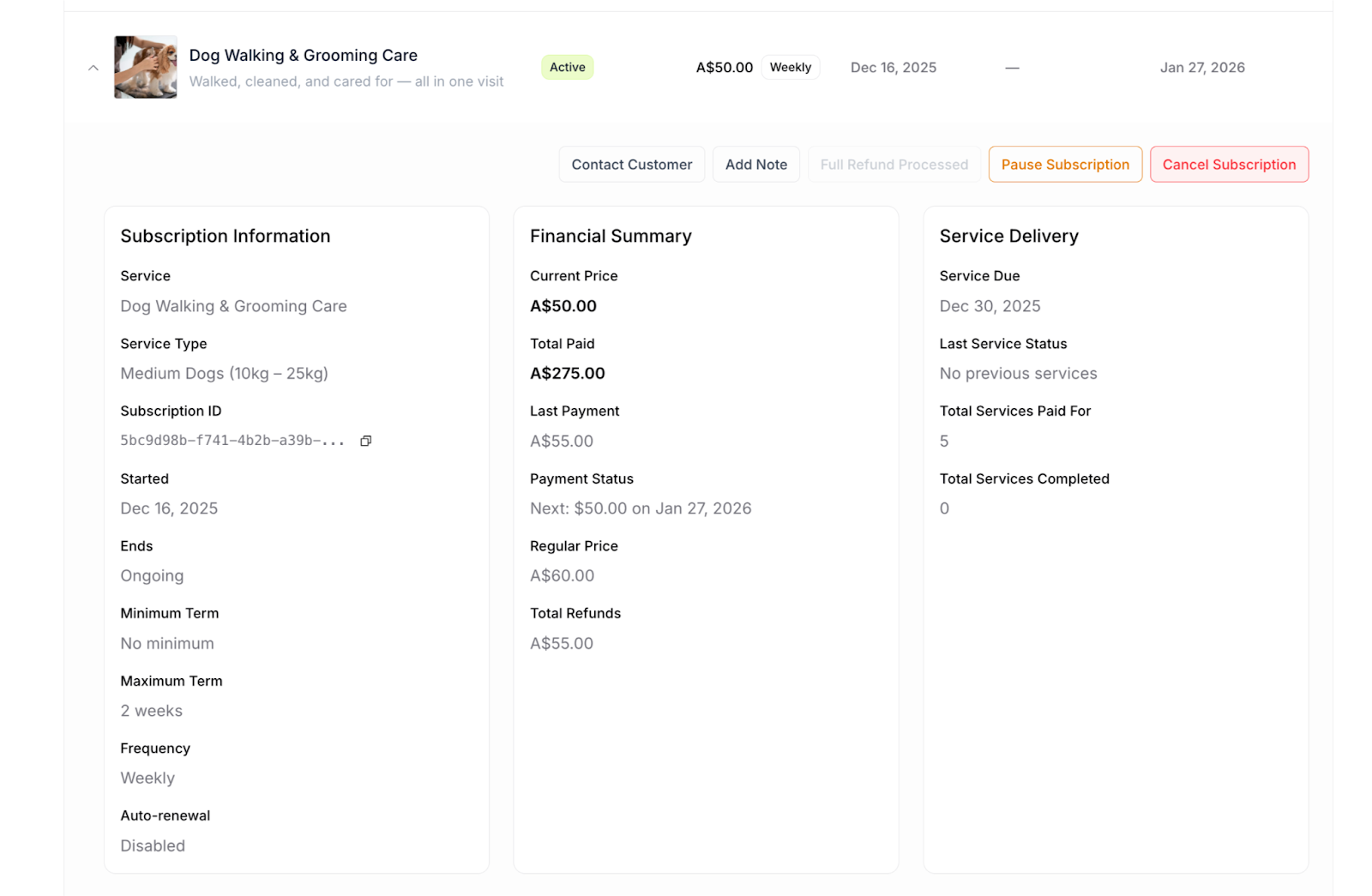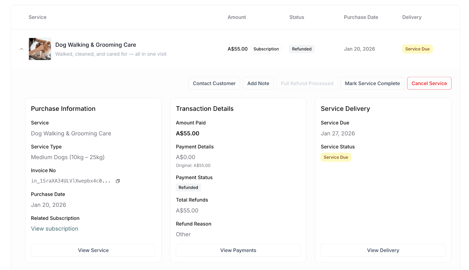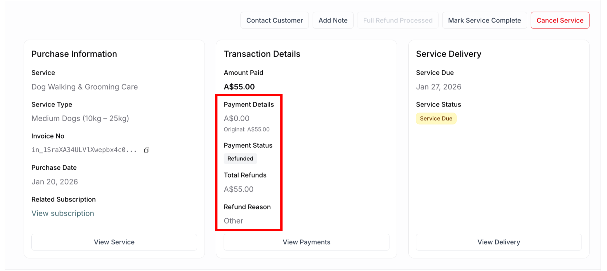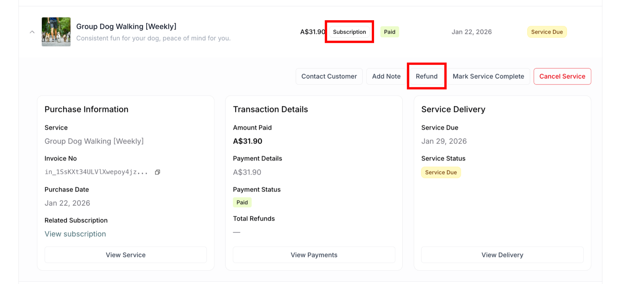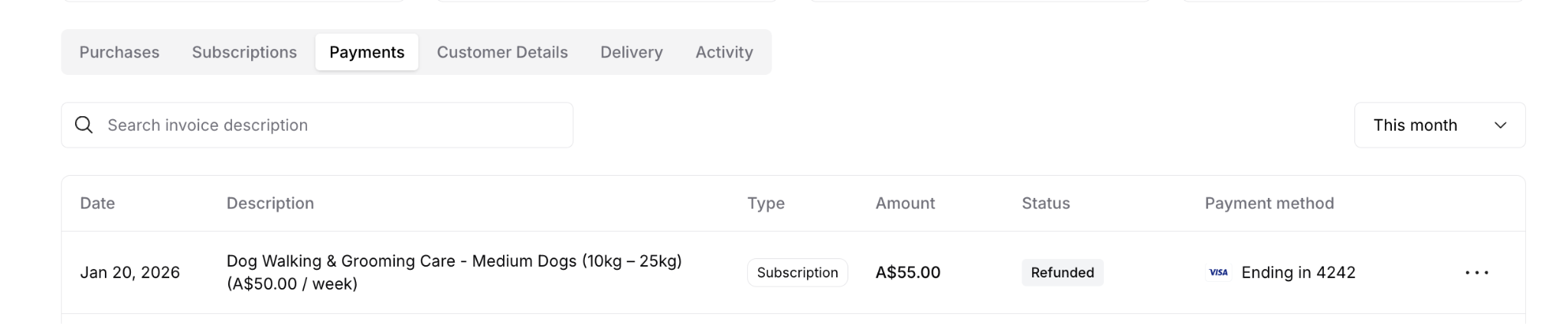 ✍️ TIP: If refunding due to cancellation, remember to also cancel the subscription. Refunding a payment alone doesn't stop future billing—you must cancel the subscription separately.