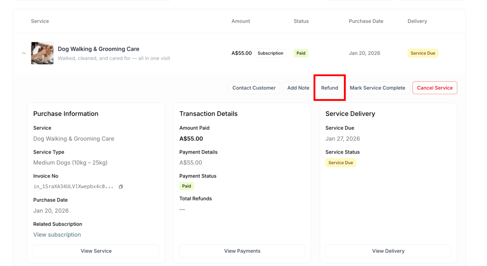 Important: Even though refund option appears in customer portal, the actual refund must be manually processed by you.
