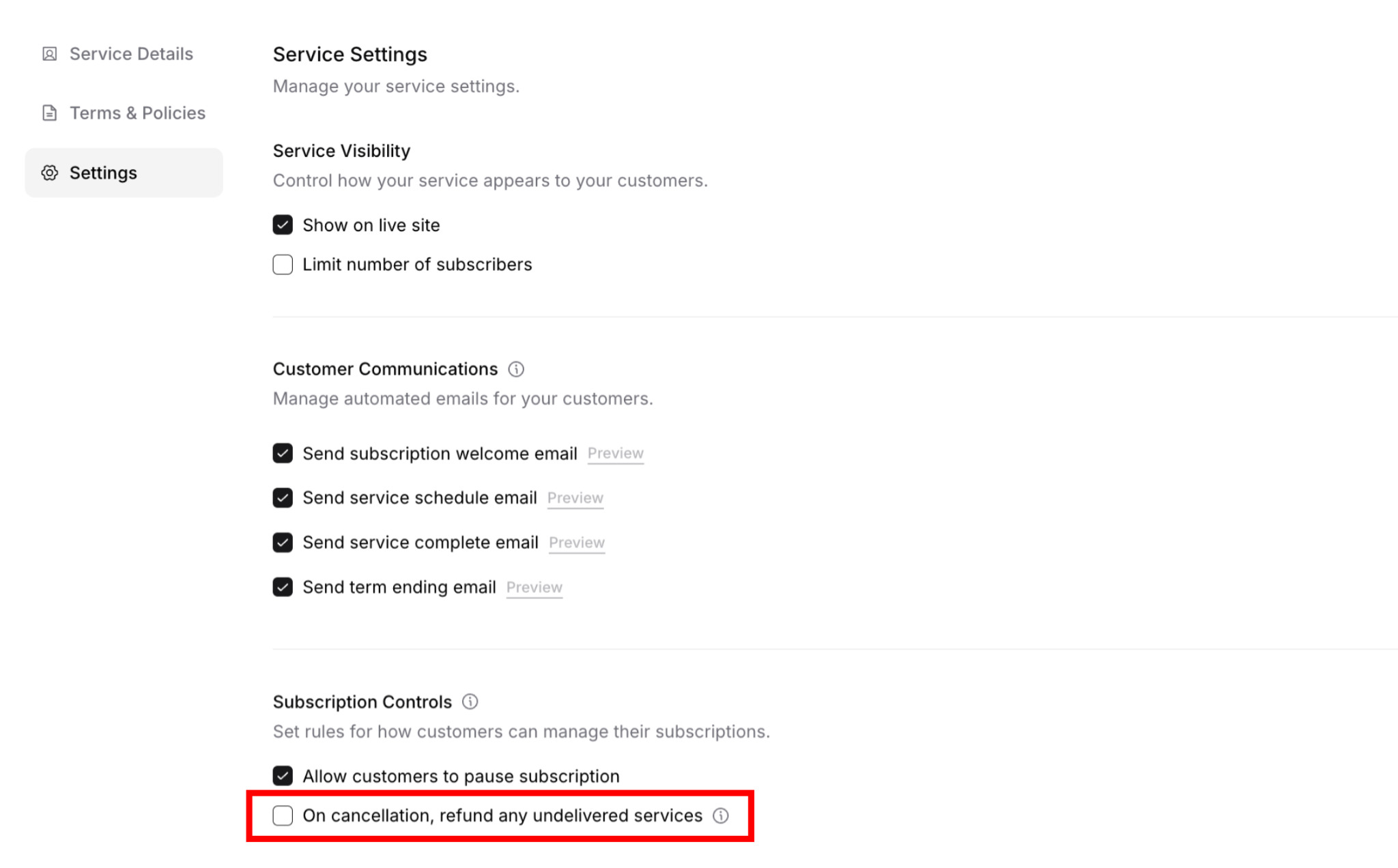 What it controls: Whether refunds are automatically processed when customers cancel subscriptions through their customer portal.