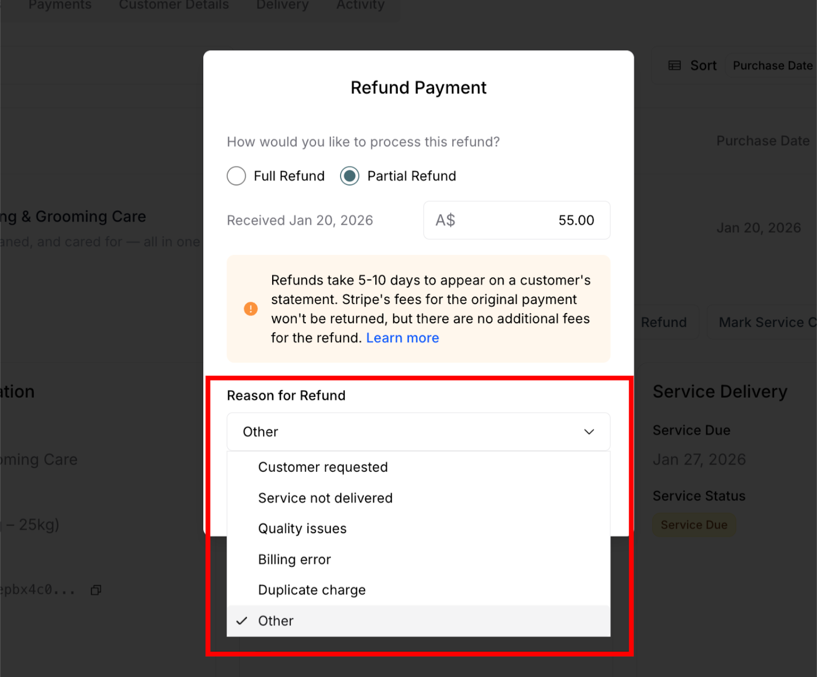 The modal includes a "Reason for Refund" dropdown with predefined options.