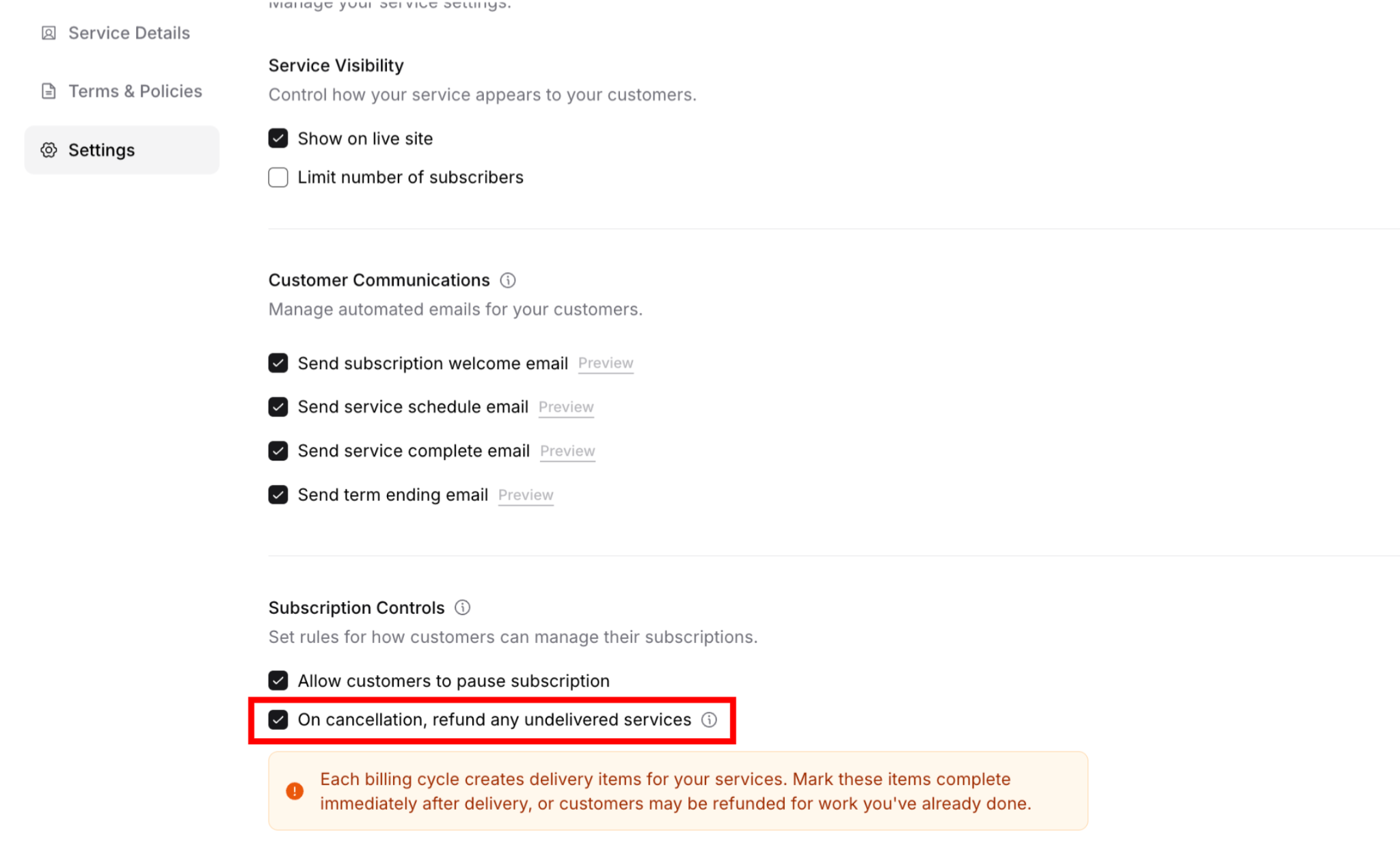Important: This only applies when customers cancel through their portal. If you cancel the subscription from your dashboard, you must manually process any refund.