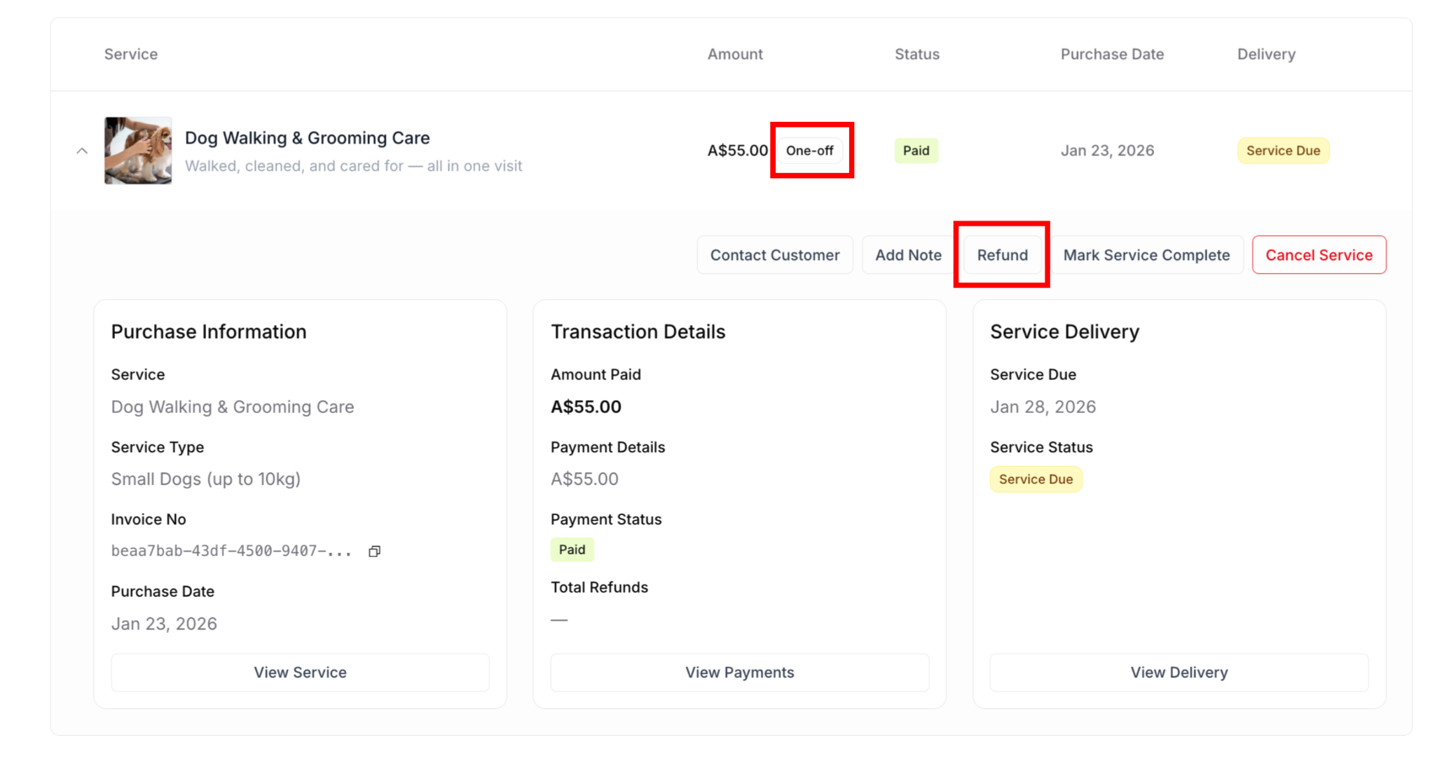 Important: Refunds can be issued for both subscription payments and one-off purchases. The process is the same regardless of purchase type.