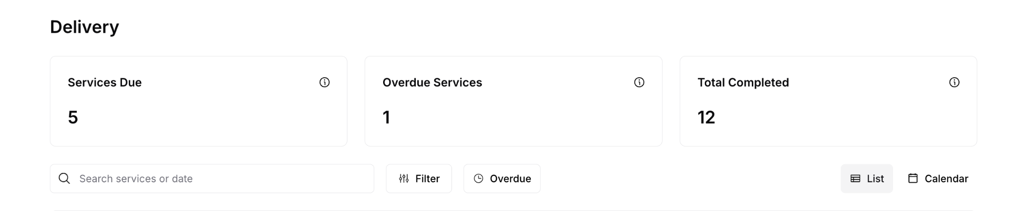 Delivery Status: Current state (Service Due, Overdue, Completed, Canceled)