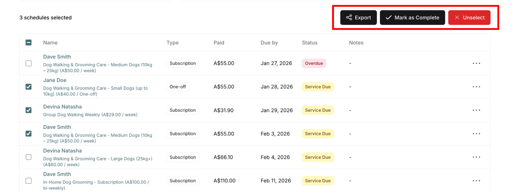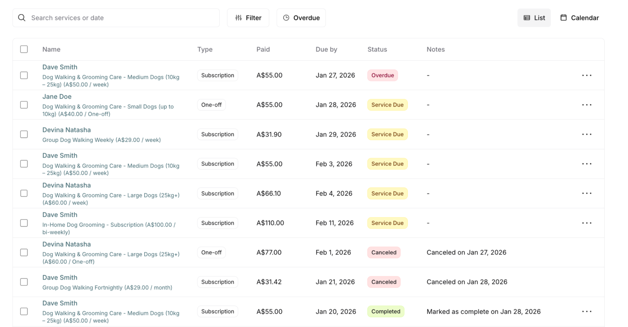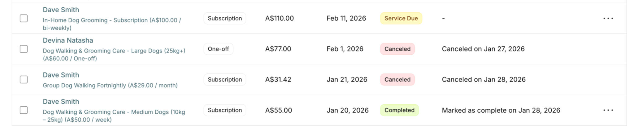 Service delivery tracking helps you manage when and how services are delivered to your customers. Whether you run a dog walking business, lawn care service, or any subscription-based operation, delivery tracking ensures every paid service gets completed on schedule.