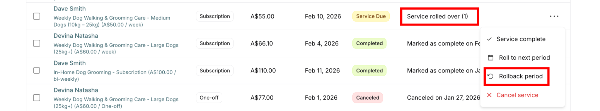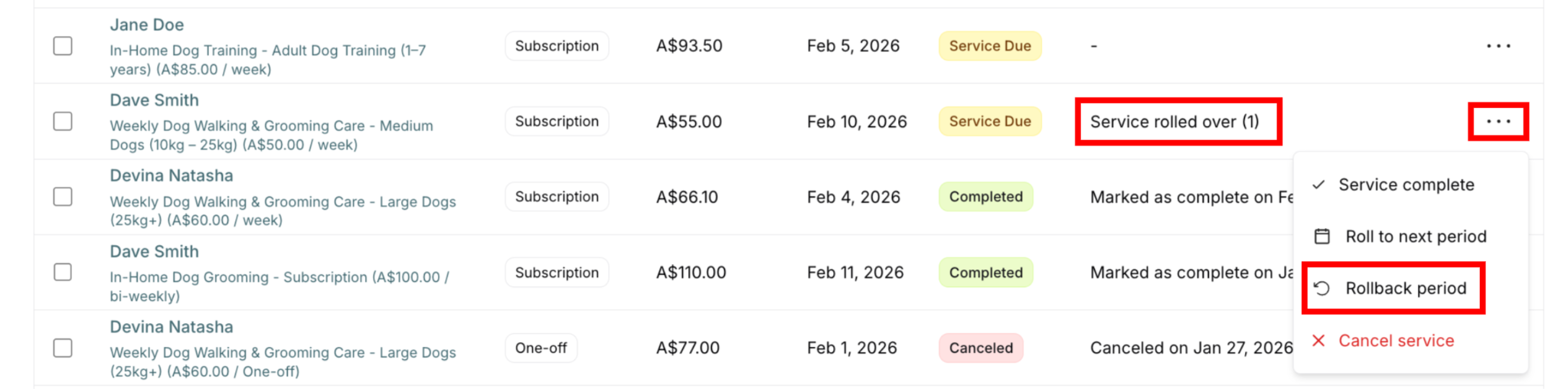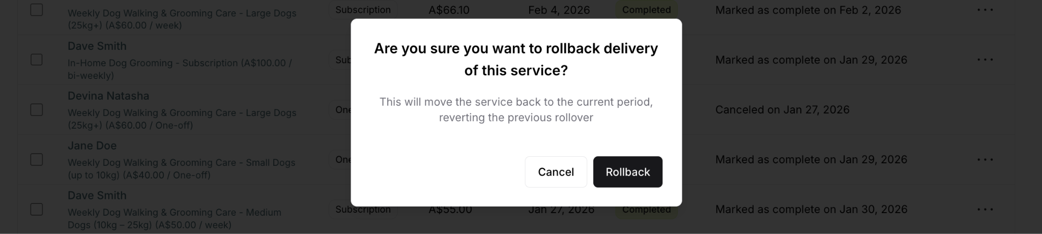 Rolling services over reschedules a delivery to the next billing period without canceling or losing the service. Rolling back reverses a rollover, moving the service back to an earlier period. These actions help you manage scheduling flexibility while maintaining subscriptions.