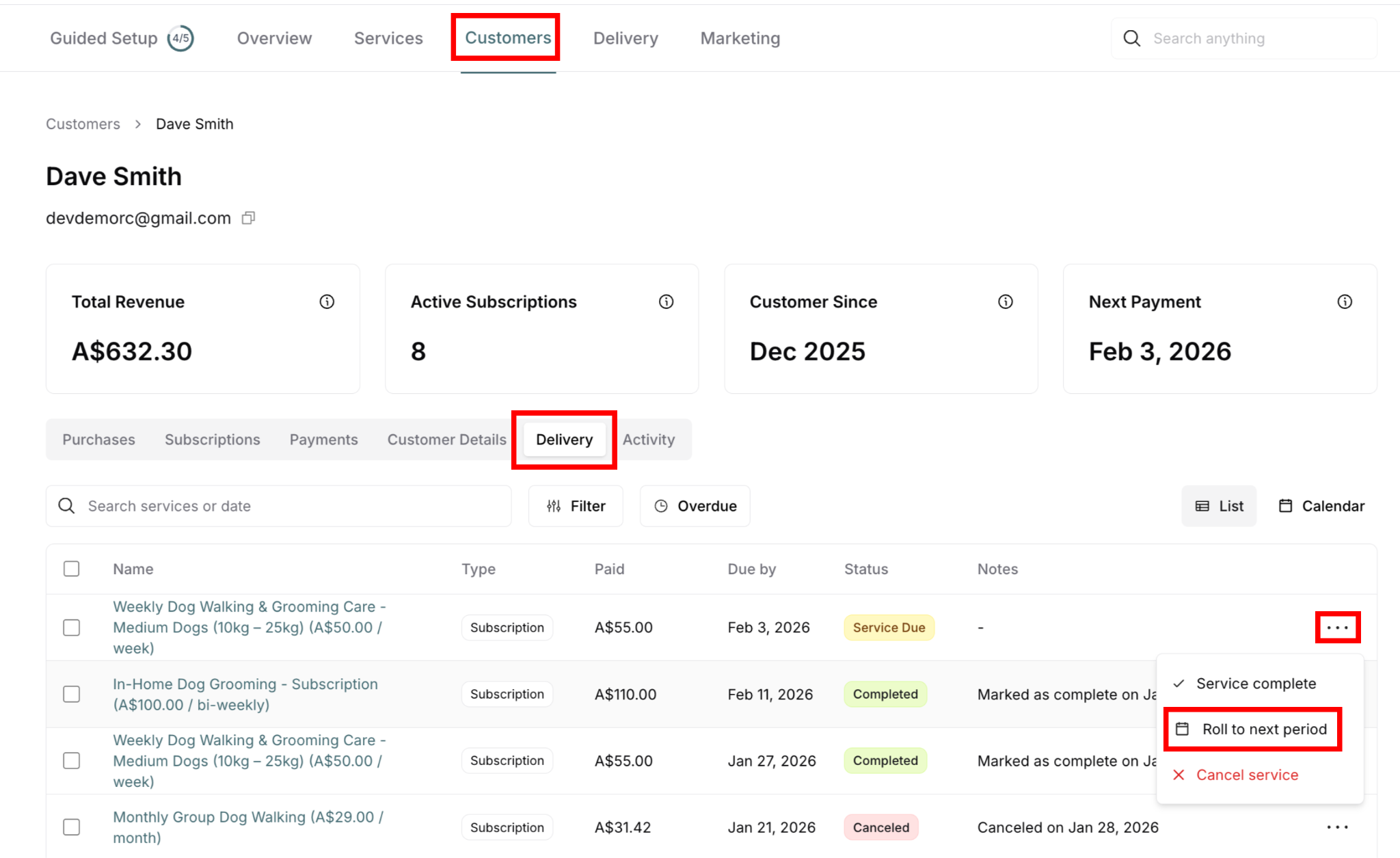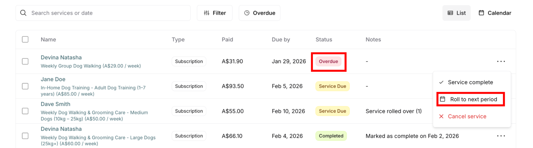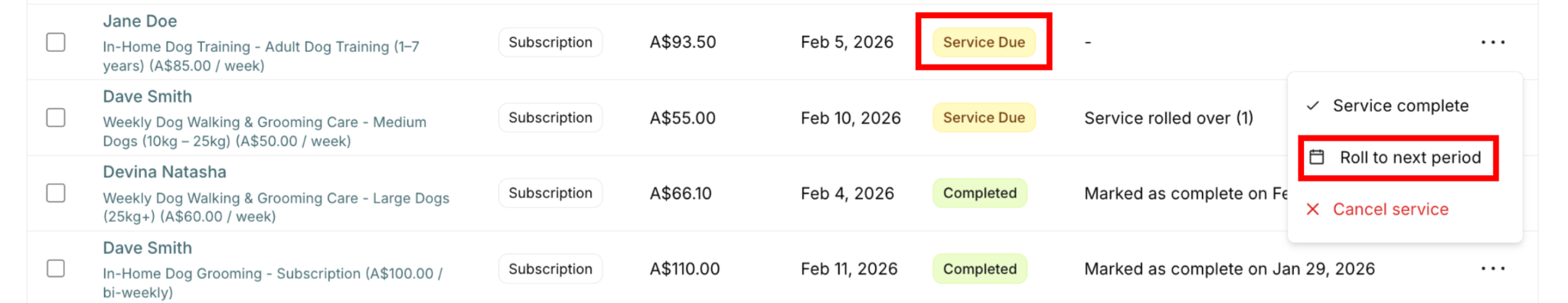 How: Find service → Three-dot menu (⋯) → Roll to next period