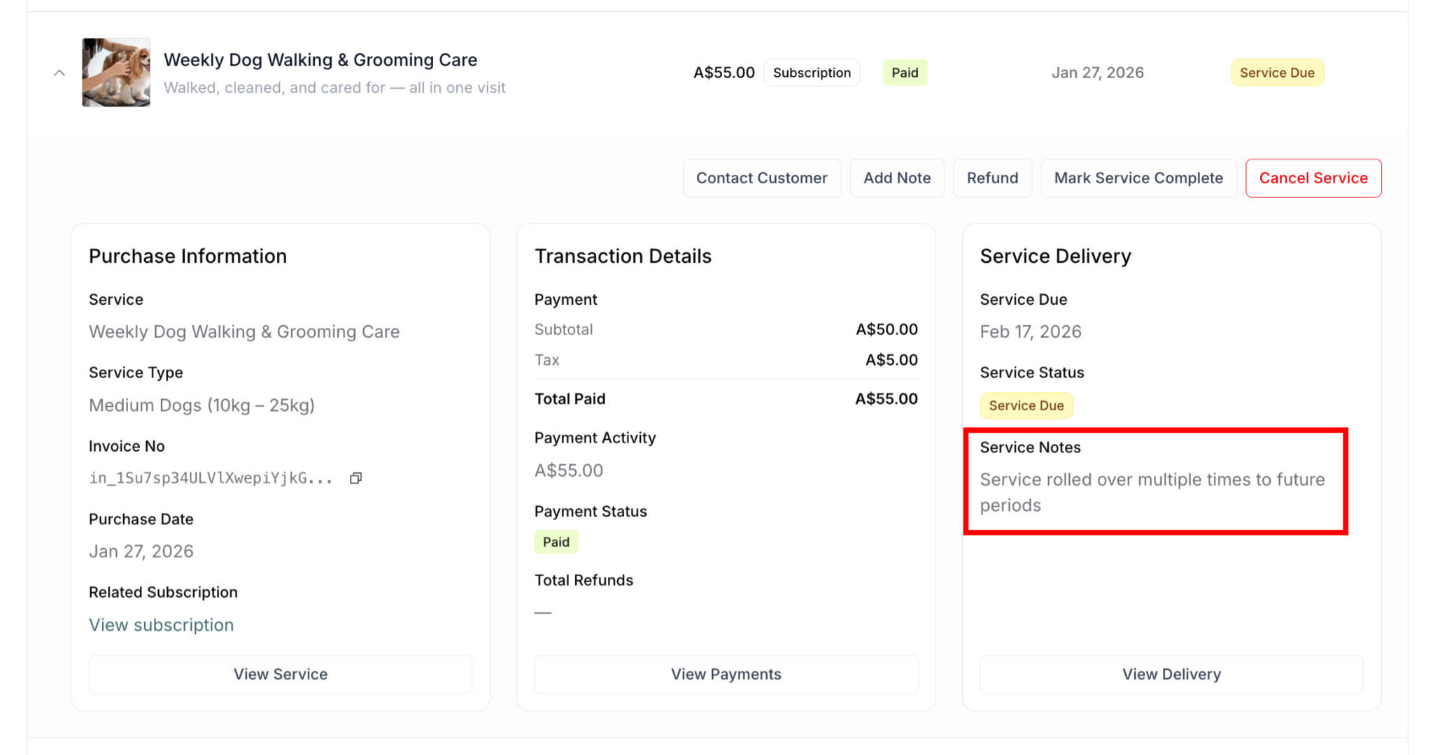 Service Notes shows: "Service rolled over multiple times to future periods"