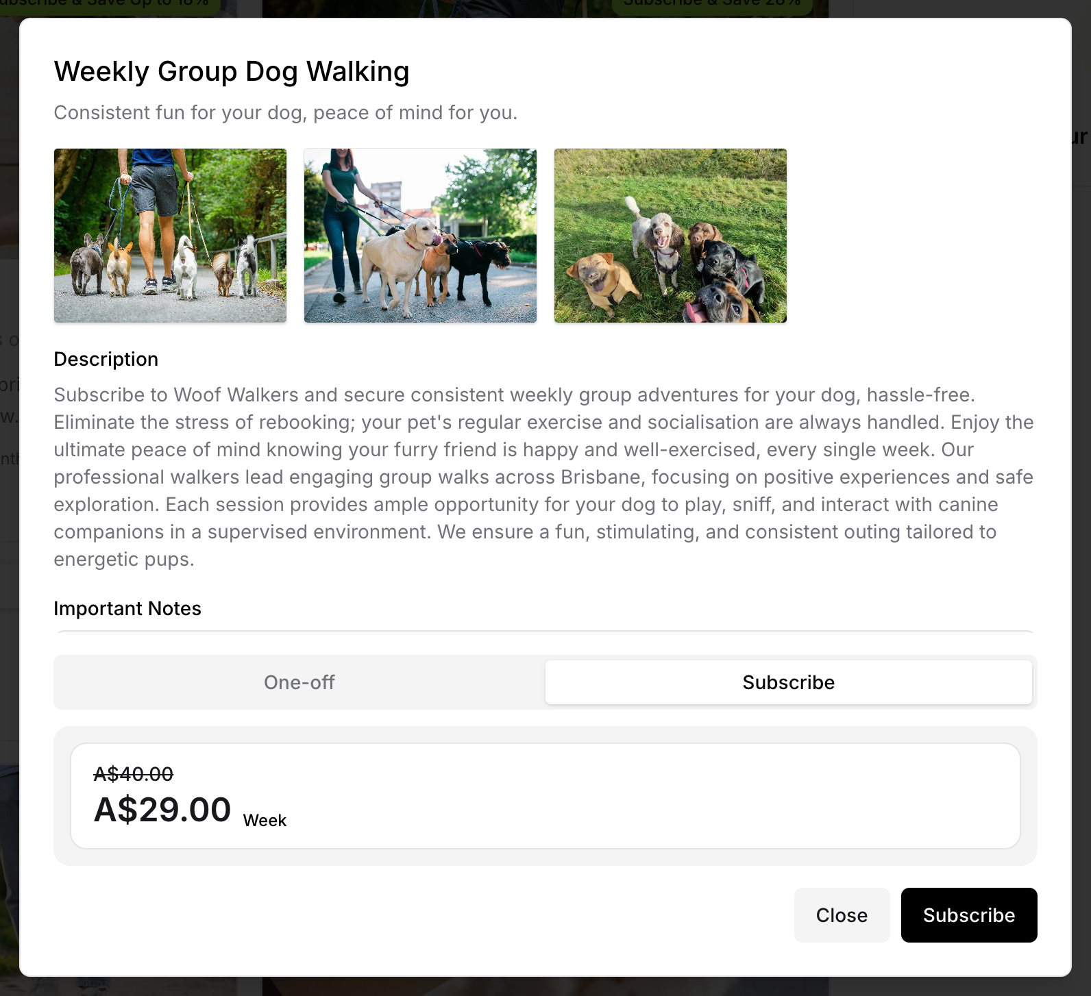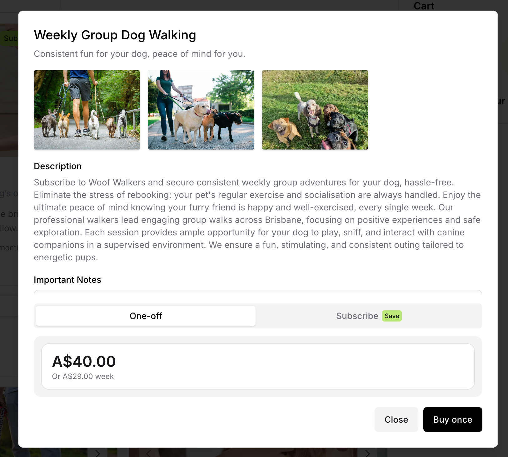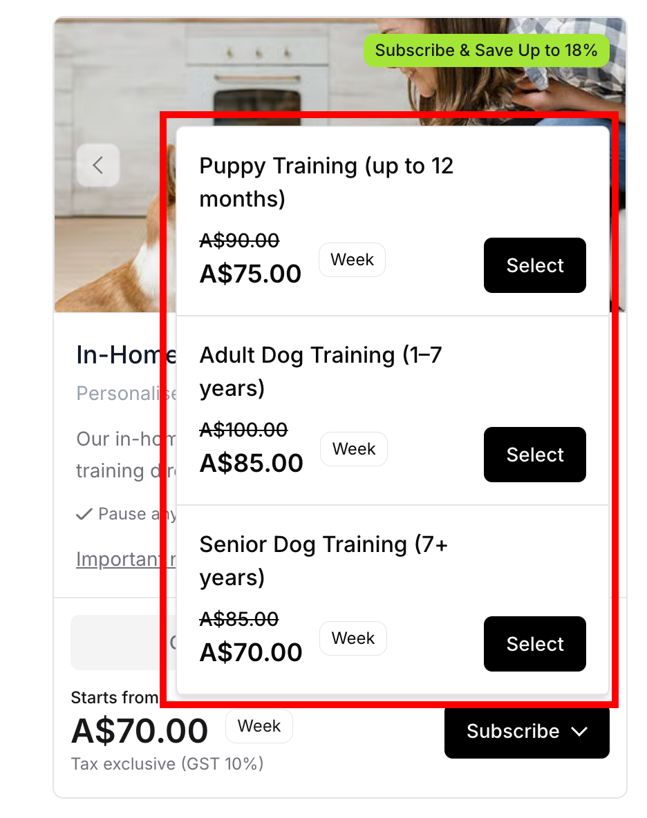 One-off pricing: "Starts from A$70.00"