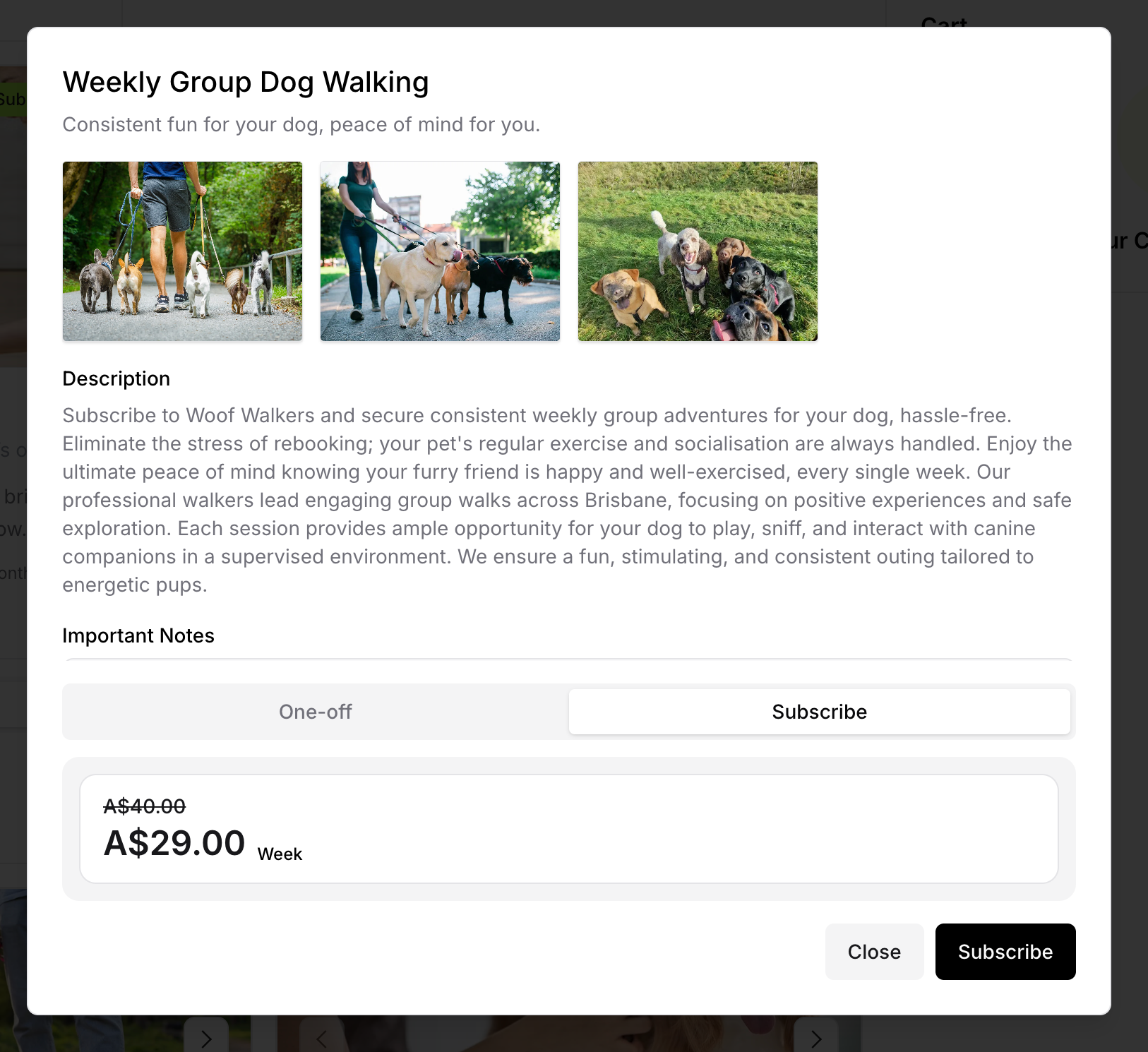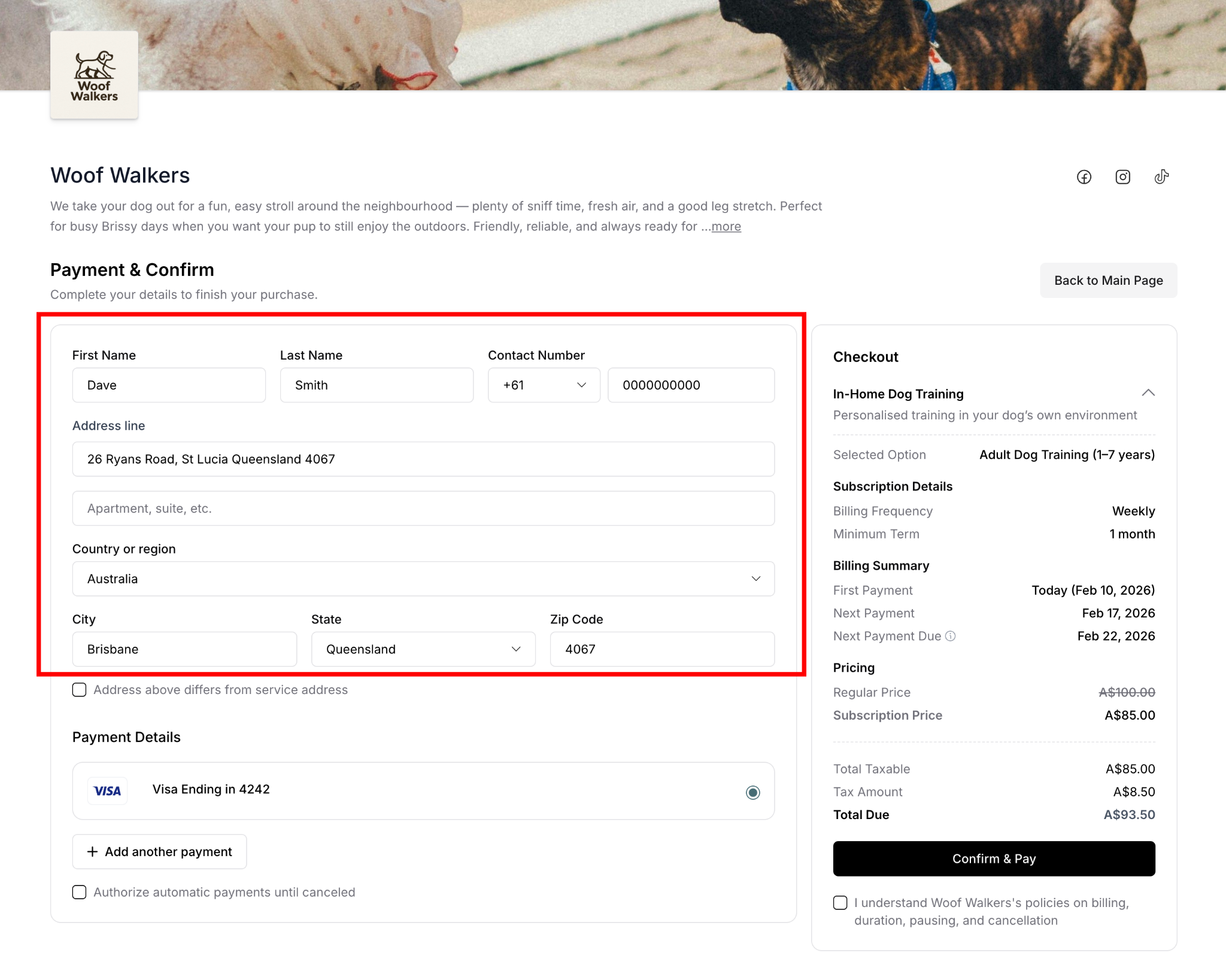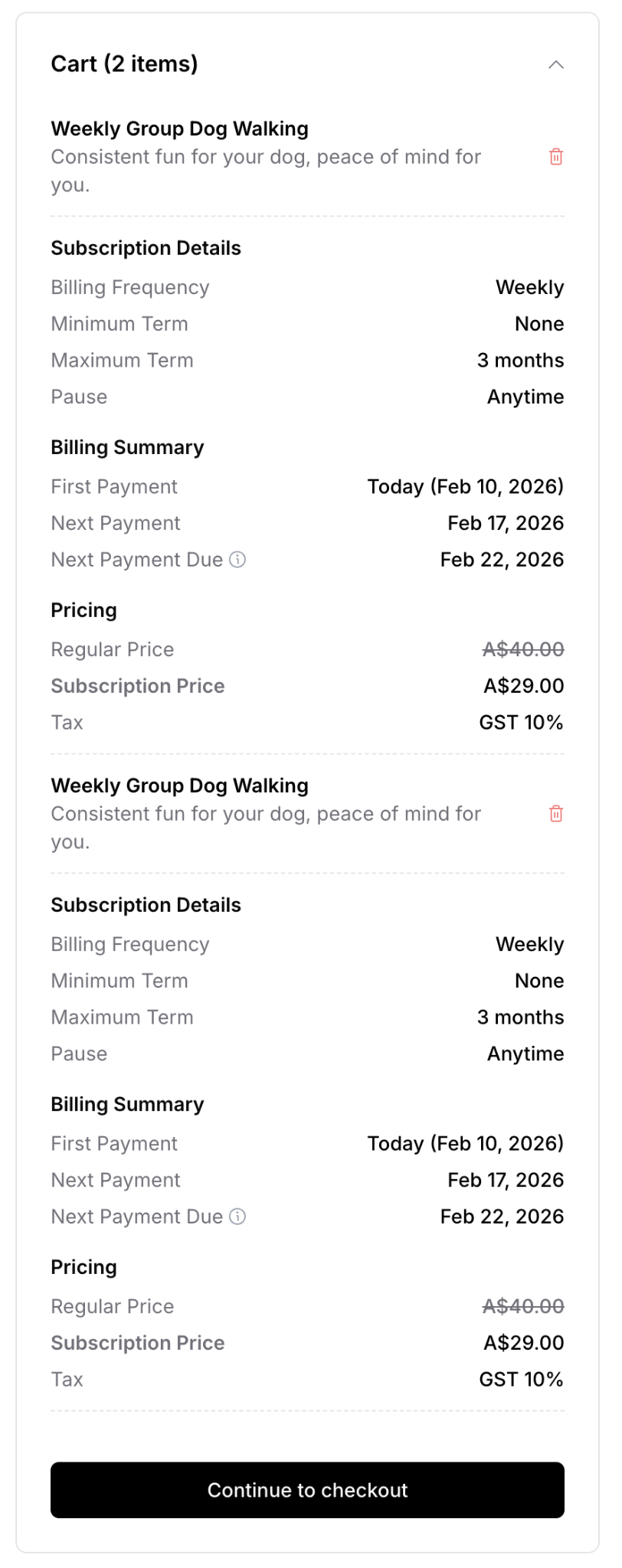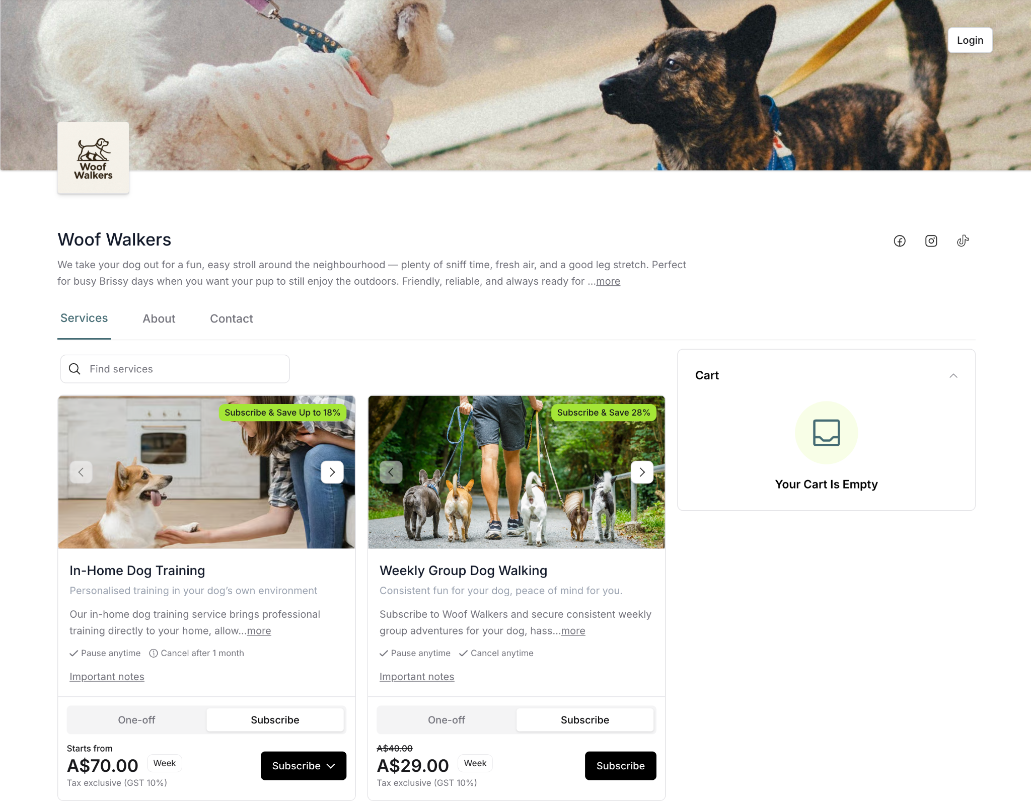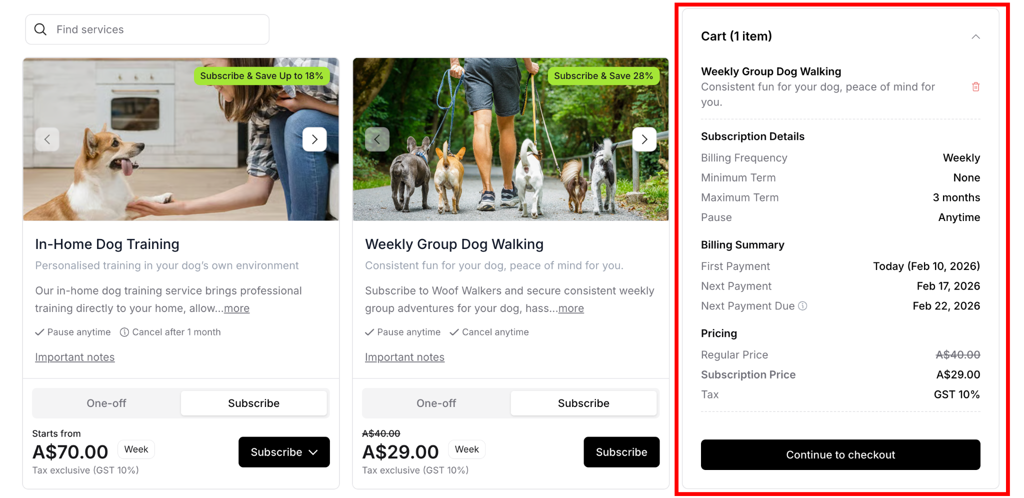 When customers visit your service page, they browse available services, select what they need (one-off or subscription), create an account, and complete checkout. The process is designed to be simple, secure, and flexible.