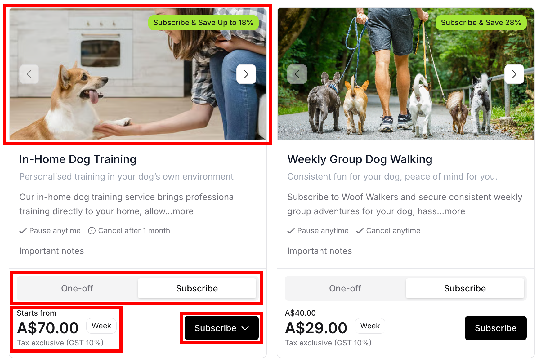Customers choose between one-off purchase or subscription for each service.