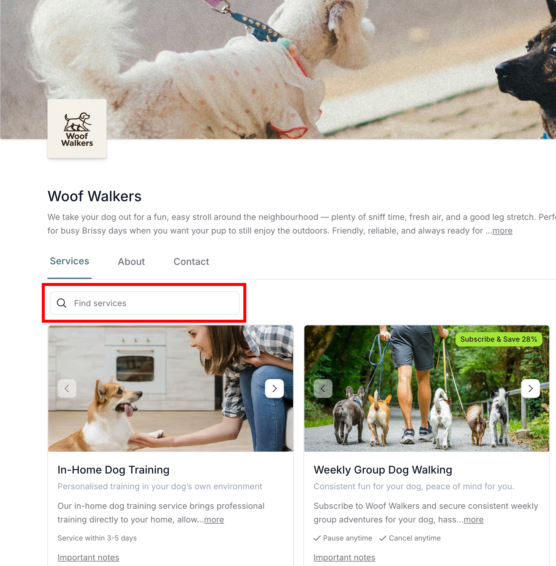 When customers arrive at your service page, they immediately see your available services displayed in a grid layout.